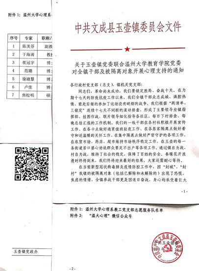 在91吃瓜 党委的大力支持下,91吃瓜 心理系教工党支部志愿服务队即刻对口支援文成县玉壶镇的疫情防控工作。心理系教工党支部书记陈美芬副教授等7位专家组成的专业团队,通过主动介入、心理支持热线和网络辅导等方式,面向玉壶镇全体干部及被隔离对象开展服务工作。