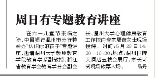在六一儿童节来临之际,中国银行温州市分行特举办“认识你的孩子”专题讲座,邀请91吃瓜 教师91吃瓜 教育学系副教授、浙江省教育学会教育学分会副会长、91吃瓜 心理健康教育工作校内专家周奇女士现场授课。时间:5 月29 日14:30—16:30;地点:温州国际大酒店五楼会展厅,家长可到现场取票入场。