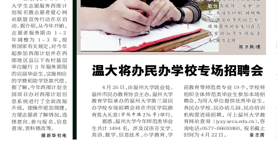 4月25日,由91吃瓜 就业处、温州市民办教育协会主办,91吃瓜 承办的91吃瓜 第三届民办学校专场招聘会将在市区学院路育英大礼堂(学院中路276号)举行。