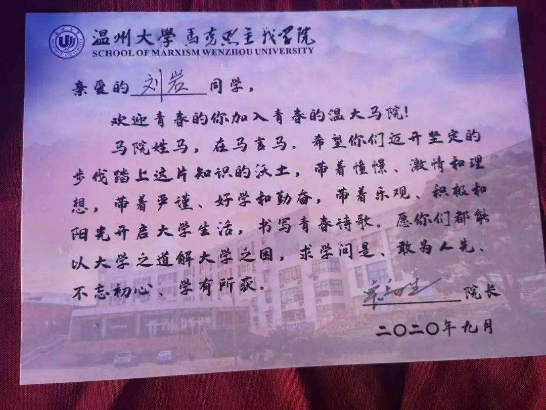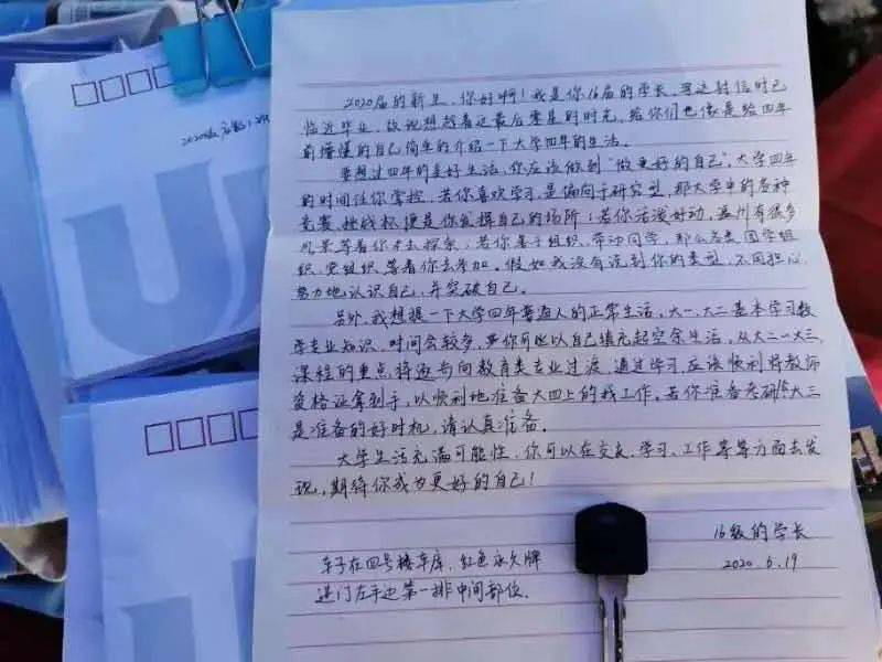 数理学院新生报到时会收到已毕业学长学姐的亲笔信,里面是对学号尾号相同的学弟学妹的深情寄语,有时还会有暖心礼物。