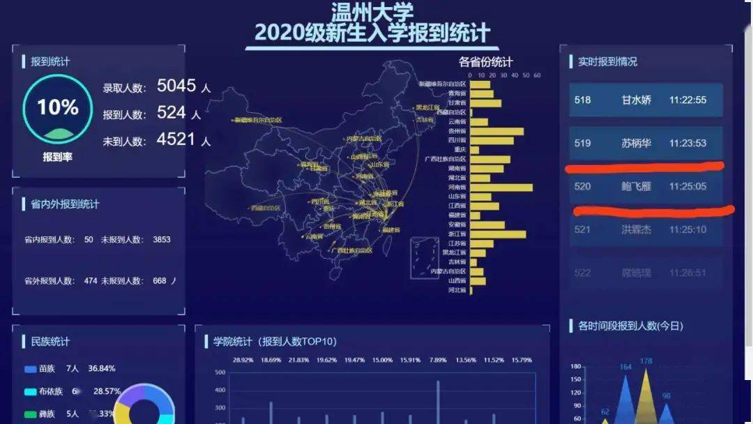在报到现场,入学手续简化,新生教育流程“前置”,“绿色通道”畅通,“二维码”扫一扫一秒报到。学校大数据迎新系统优化升级,实时反馈新生数据,师生可以通过大数据平台和校园内的电子大屏实时查看新生报到情况,同时还可以实时查看自己是第几位报到的同学,与自己的报到号打卡合影。