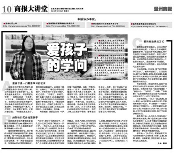 ●讲座内容:教育孩子的方式很多,换种方法有时可能会收到更好的效果。父母是孩子的第一任老师,也是孩子终身的老师,父母都爱自己的孩子,但爱不是个简单的问题,爱需要教育,要让孩子们知道什么是真正的爱,如何去体验爱,如何去真正地爱别人。这是我们一切教育的基础和核心。