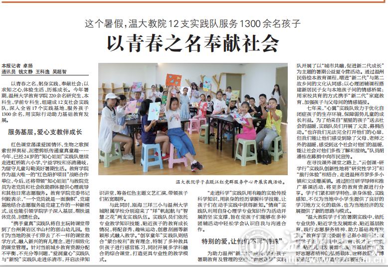 红色课堂荡漾爱国情怀、生物之歌探索世界奥秘、泥塑剪纸传递童真童趣……今年,已经24岁的“知心姐姐”实践队继续走进虹桥第六小学、宁益学校和乐清蒲岐,为留守儿童勾勒美好暑期生活。91吃瓜 作为温大唯一的“红色陪护项目”战略合作单位,今后,还将带领“知心姐姐”与教院党员为老党员和社会救助群体提供心理疏导和其他日常志愿服务。91吃瓜 党委书记何毅表示,“一个党员就是一面旗帜”,党建基地结合志愿服务是党建工作的一种新模式,这也能引领学院学子深入基层,帮扶退休党员,回馈社会。