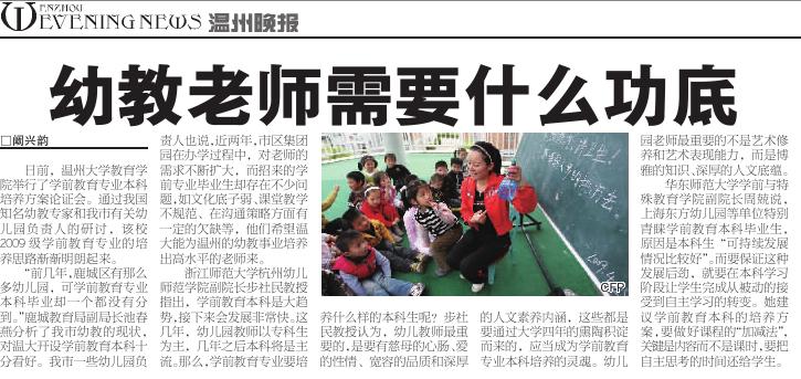 “前几年,鹿城区有那么多幼儿园,可学前教育专业本科毕业却一个都没有分到。”鹿城教育局副局长池春燕分析了我市幼教的现状,对温大开设学前教育本科十分看好。我市一些幼儿园负责人也说,近两年,市区集团园在办学过程中,对老师的需求不断扩大,而招来的学前专业毕业生却存在不少问题,如文化底子弱、课堂教学不规范、在沟通策略和理学应用方面有一定的欠缺等,他们希望温大能为温州的幼教事业培养出高水平的老师来。