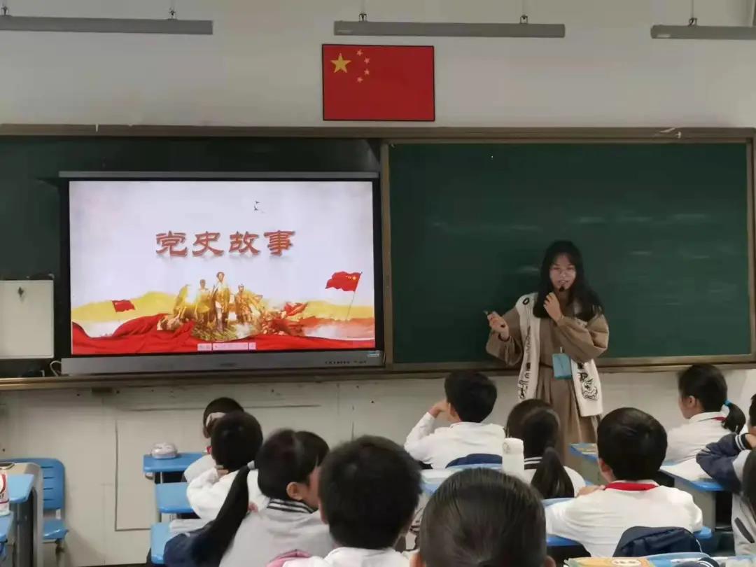 黄炜婷同志在北大新世纪温州附属学校开展了主题为“少年朱德的故事”的小课堂,向学生介绍朱德年少成长的故事,使学生从中汲取朱德同志在生活中积极向上和艰苦奋斗的精神,珍惜当下和平的幸福生活。郎晗笑同志在温州市广场路小学开展了《永不褪色的红色记忆——忆党的峥嵘岁月》教育活动。在活动中,介绍了党旗与中国共产党的由来,并组织学生开展“从小学党史,永远跟党走”主题探究讨论,深化知史爱党、知史爱国的思想。通过此次活动,希望学生能从小牢固树立感党恩、听党话、跟党走的坚定信念和远大理想。王莹如同志围绕“讲党史,树新风,争做新时代好少年”展开各项活动。王莹如同志从故事引入,通过具体情境给孩子铺垫党和人民关系的思考,再通过概述党成长历程的短视频让孩子们对中国共产党的成长过程有了一个大致了解。为达到激励孩子们争做新时代好少年的目的,他们给孩子们放了“请党放心强国有我”的集体献词,舞动人心的演说带给孩子们深深的震撼,而后全班孩子们也学着视频的气势铿锵有力地留下自己的誓言。接着,许俊妍同志带着孩子们观看《长津湖》影片,让孩子们看到那个时代下的中国青年,引导孩子们以他们为榜样,继承革命先辈的光荣传统。