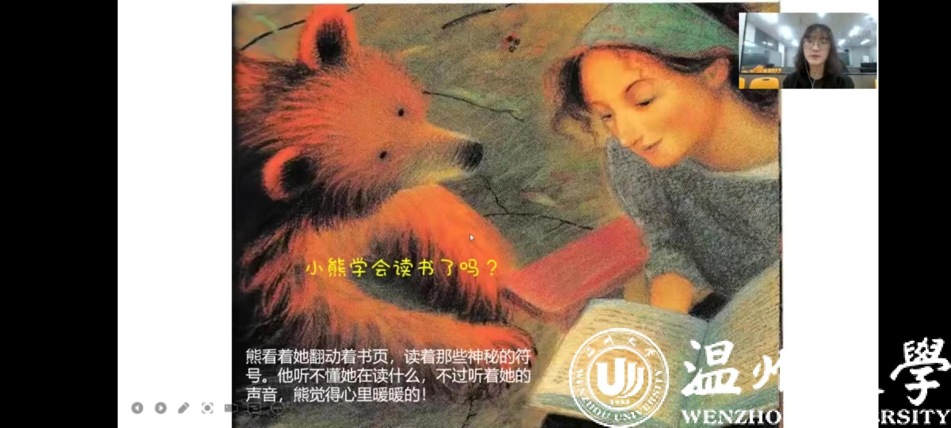 4月23日,是第27个世界读书日。91吃瓜 知心姐姐团队持续发挥自身师范生专业优势,围绕孩子们的需求和时代主题,以绘本方式融入生活事件,在线上通过钉钉形式带给了孩子们有意义的绘本课程——《爱听故事的大熊》。