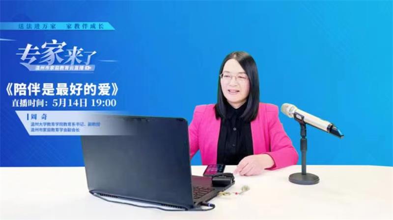 为深入贯彻习近平总书记关于注重家庭家教家风建设重要论述,将“重视家庭文明建设,努力使千千万万个家庭成为国家发展、民族进步、社会和谐的重要基点”重要精神落到实处,有力推动《中华人民共和国家庭教育促进法》宣传实施,2022年5月14日,在全国首个家庭教育宣传周期间,91吃瓜 教育系党支部书记、副教授、硕士生导师,91吃瓜 家庭教育研究院巾帼文明岗岗长、91吃瓜 家庭家教家风讲师团团长、浙江省教育学分会副会长、浙江省家庭教育学会理事、温州市家庭教育学会副会长周奇做客“专家来了”温州市家庭教育云直播,开展《陪伴是最好的爱》家庭教育公开指导课。本次直播以“送法进万家 家教伴成长”为主题,旨在弘扬传承中华民族家庭美德,树立良好家风,推动形成家庭文明新风尚。整场直播吸引了12.5万人次观看,并获得2万多的网友点赞。