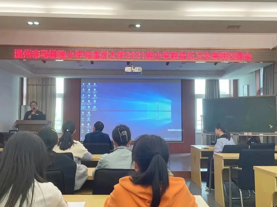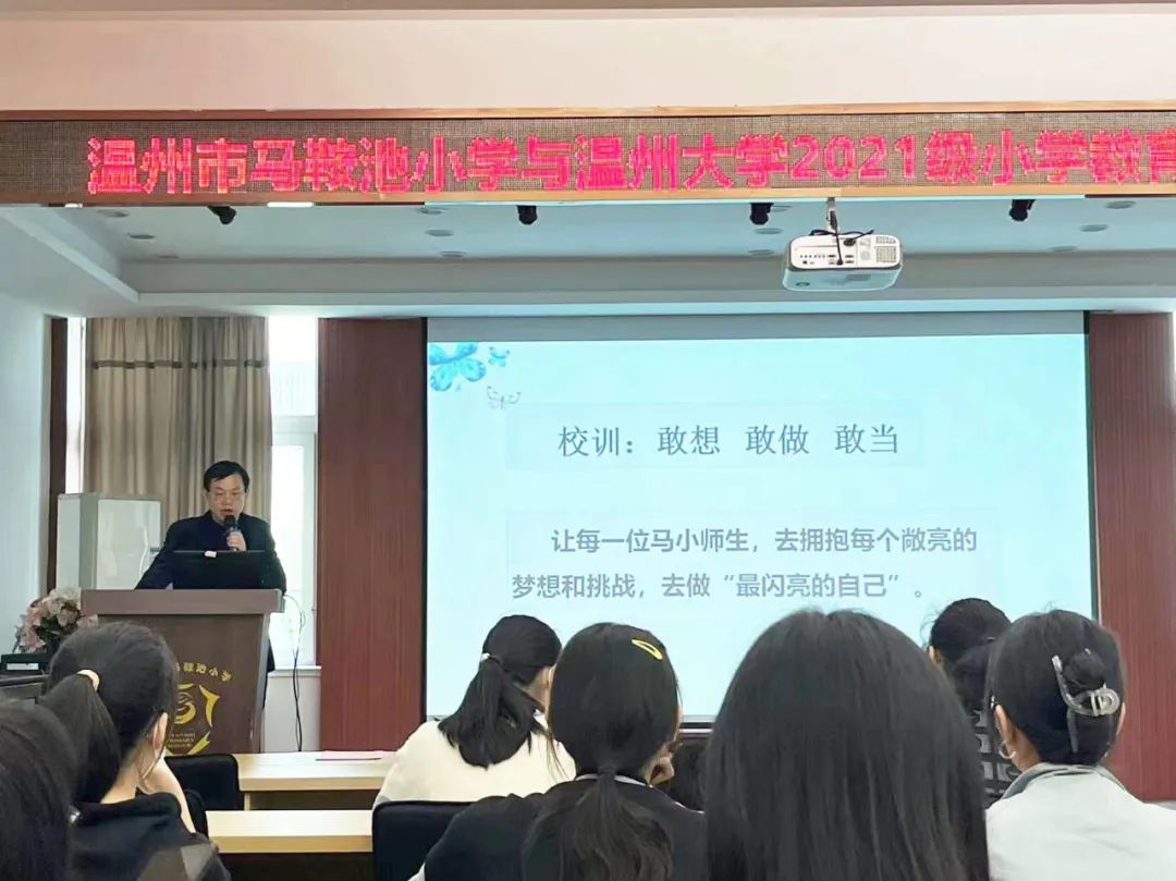 见面会伊始,温州市马鞍池小学校长生盛道新老师从学校的地理位置、校园文化、教学项目及教学改革四个方面向见习生们介绍了马小,见习生们也深刻体悟了马小的办学理念和深厚的文化底蕴。同时,盛校长也用马小“敢想、敢做、敢当”的校训来激励见习生们,希望见习生们能拥抱闪亮的梦想,挑战做最闪亮的自己。