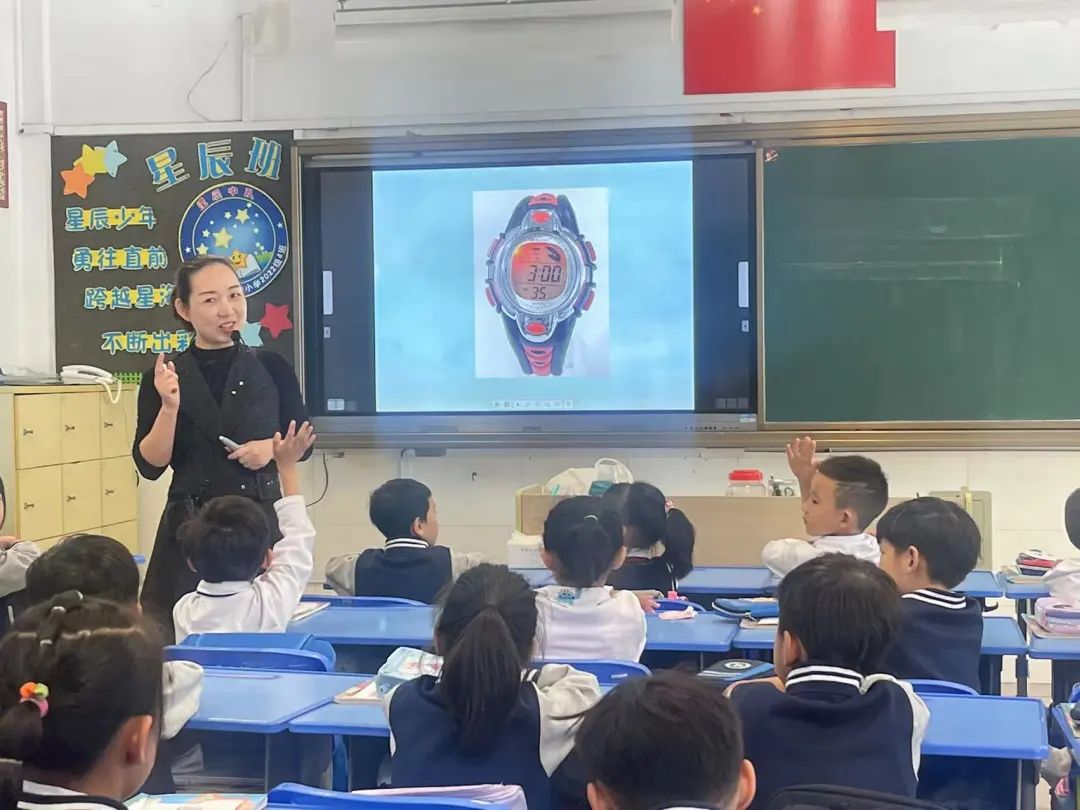 娄天婵老师为我们带来一节一年级上册的数学课堂《认识钟表》。在课堂当中,娄老师注重口诀记忆法,她将自己摆成一个钟表的形状,并向学生传授口诀“12点点头,6来跺跺脚,右手抓抓3,左手摸摸9”,以具象而直观的方式辅助学生对于钟表的记忆。同时,娄老师灵活运用教具教学,通过学生自己手动拨指针的方式,让学生通过实践,真实感受到钟表指针运作的规律,在学习钟表的同时,调动学生学习积极性,提高课堂效果。