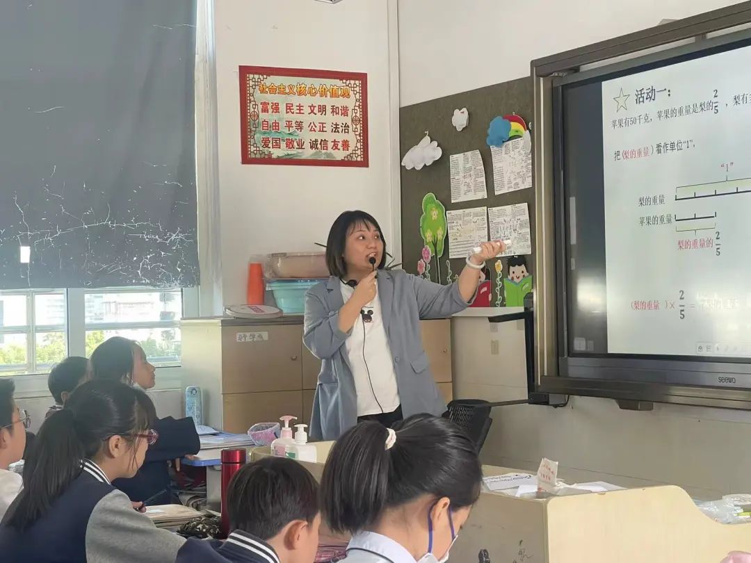 叶佳佳老师在六(3)班为我们带来一节六年级上册数学课《分数除法解决问题》。课堂当中,叶老师十分注重作图的规范化与拓展思维。老师通过展示学生优秀的和具有典型错误的作品,引导学生规范作图,以直观而清晰的线段理解题目和解决题目。同时,叶老师创设的问题多是“你还有什么想法”,以自然的语调精炼且巧妙地打开学生的思维,培养了教师与学生的默契度,课堂效率显著。