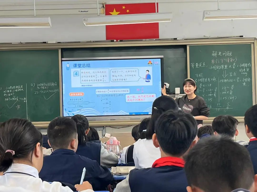 不同于叶老师,陈芳老师紧紧围绕“人体奥秘”的主线,创设了有关人体水分、人体脂肪、人体脚长的三个不同的情境,提出了三个关联问题,并进行了不同程度的探讨,详略分明。对于第一个水分问题,陈老师注重基础,从读题到检验每一环节都进行了详细的讲解,每一步骤,每个细节都落实到位。