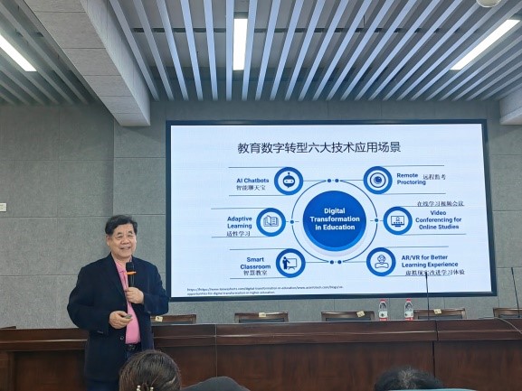 本次讲座,祝智庭教授从“教育数字化转型正在兴起”“智慧教育引领教育数字化转型”“智慧教育实践案例点彩与行动建议”等三个方面系统阐述了教育数字化转型的意义与方式。