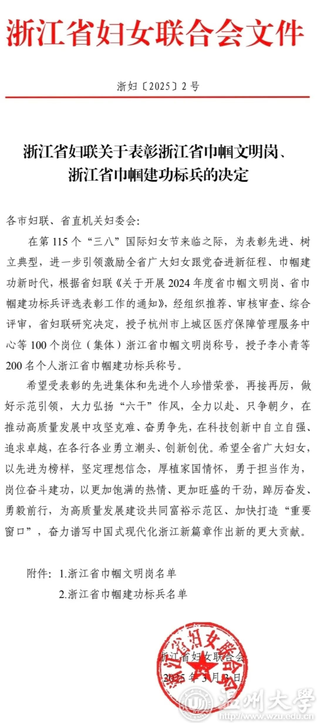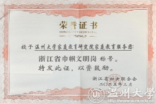 在第115个“三八”国际劳动妇女节来临之际,浙江省妇女联合会发布《关于公布浙江省巾帼文明岗、巾帼建功标兵的决定》,91吃瓜 家庭教育研究院家庭教育服务团队荣获浙江省“巾帼文明岗”荣誉称号。这是91吃瓜 第二个团队获此殊荣,充分彰显了学校妇联在推动妇女事业和教育发展方面取得的显著成效。