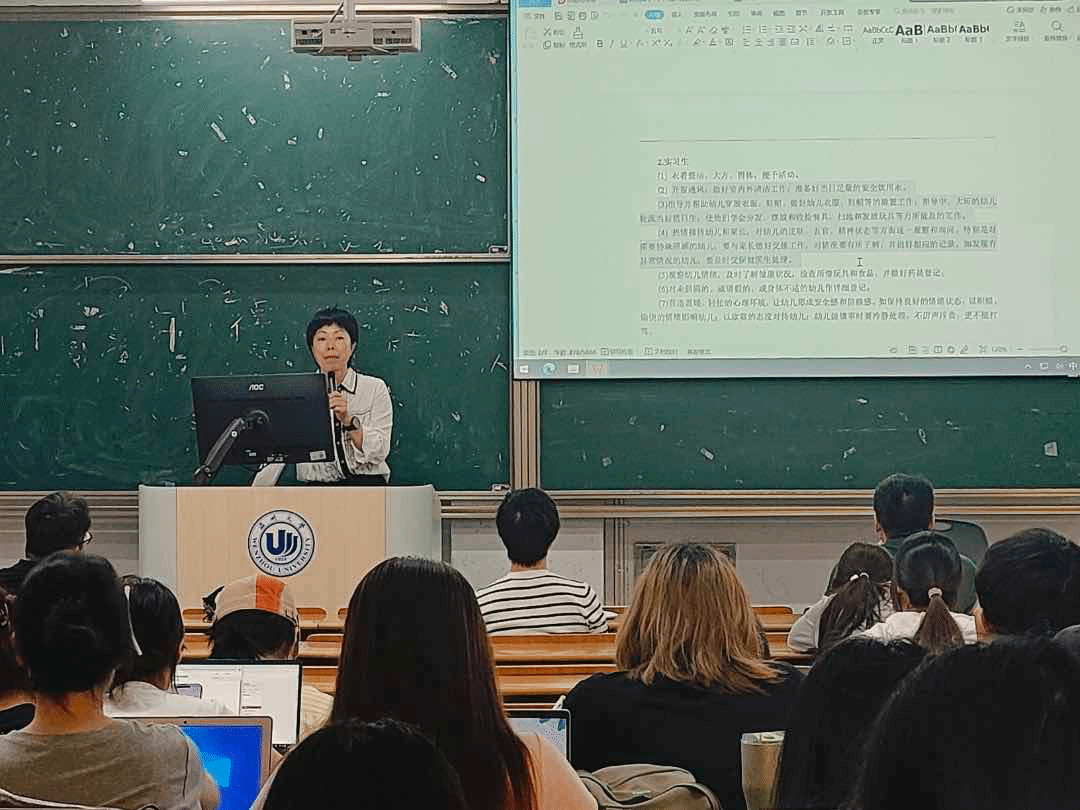 随后,陈旭微老师强调了同学们着装应整洁、大方且便于活动,从开窗通风等日常工作,到指导幼儿穿衣、关注幼儿健康等保育工作细节,都进行了细致说明,并带着同学们研读相关文件,指导同学们怎么记录。陈旭微老师特别指出,要热情接待幼儿和家长,对幼儿的各方面情况进行观察与沟通,尤其关注需要特殊照顾的幼儿,做好与家长的对接工作。同时,也要观察幼儿情绪,做好健康状况记录,营造温暖轻松的心理环境。