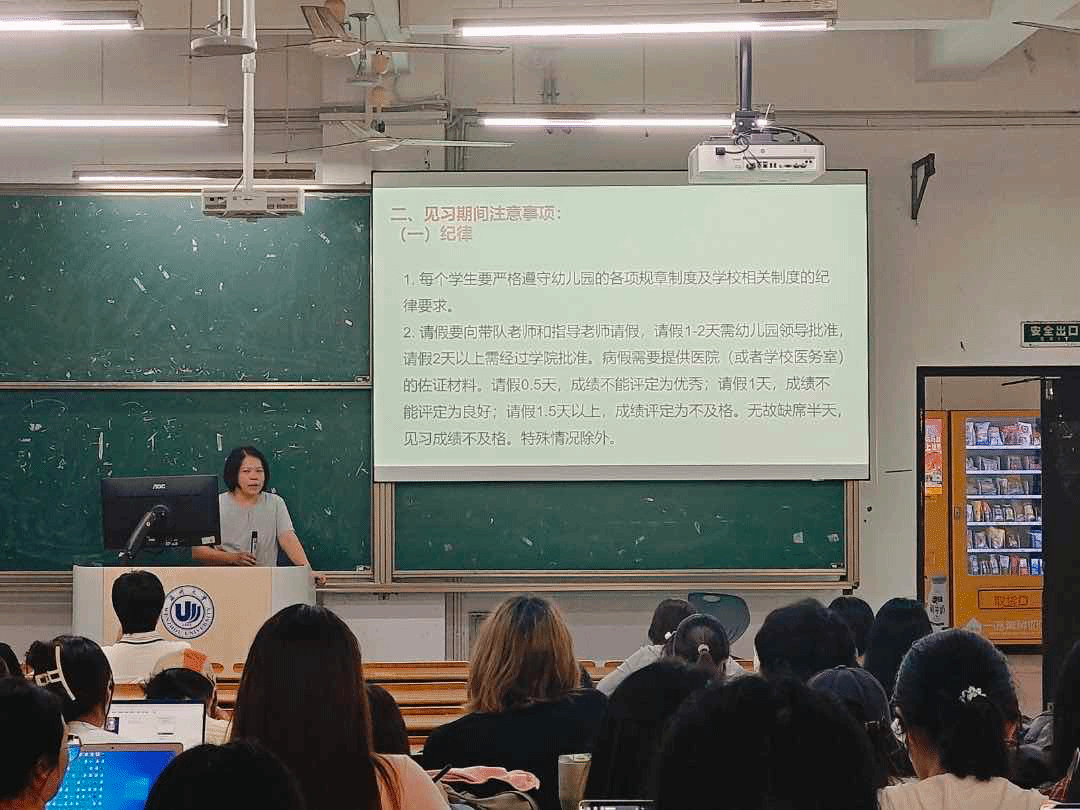 大会伊始,张晓霞老师围绕见习工作展开讲解。她就见习期间的注意事项进行重点强调。在纪律方面,她要求学生严格遵守幼儿园及学校的各项规章制度,详细说明了请假流程及不同请假时长对见习成绩评定的影响。