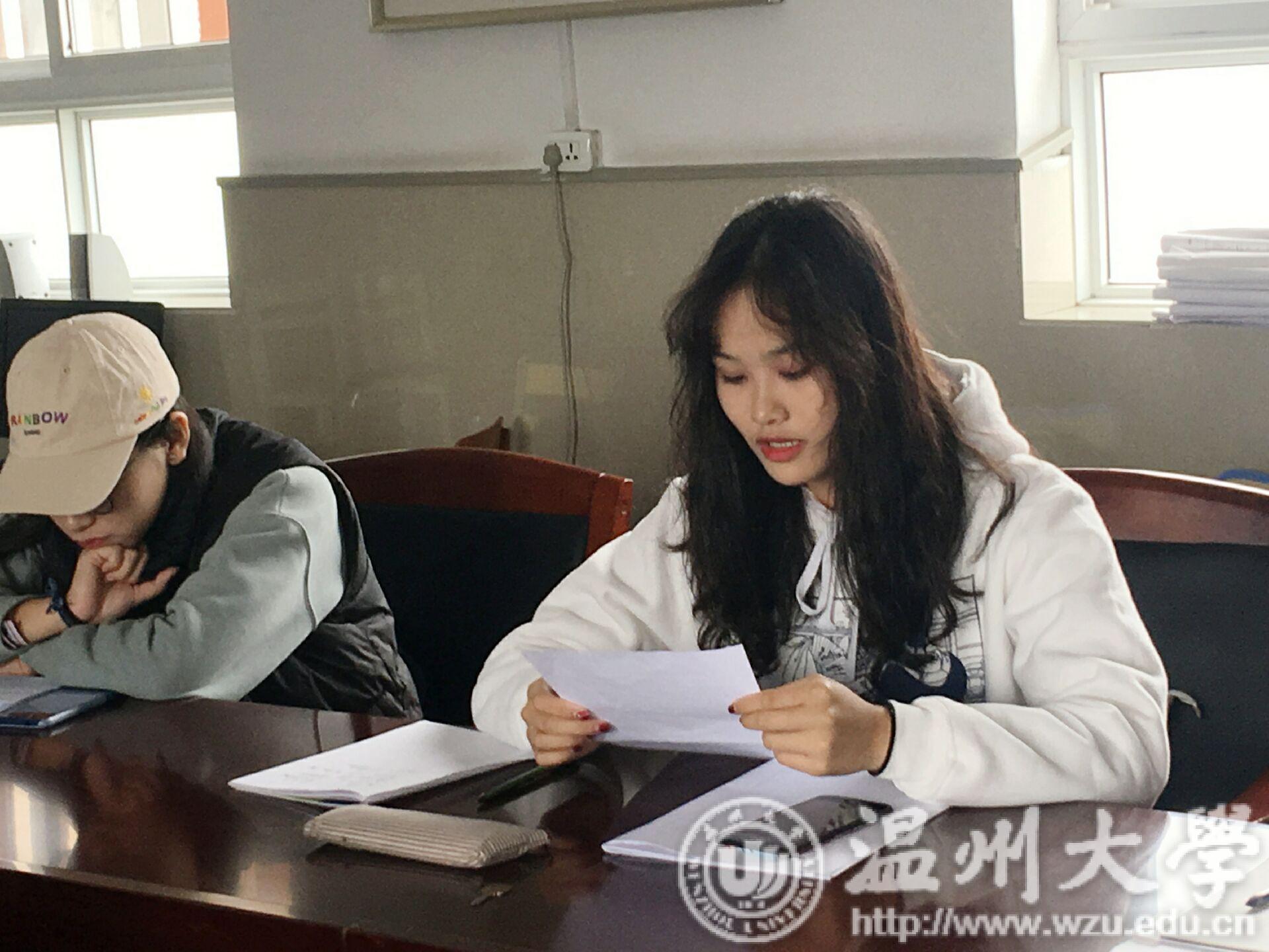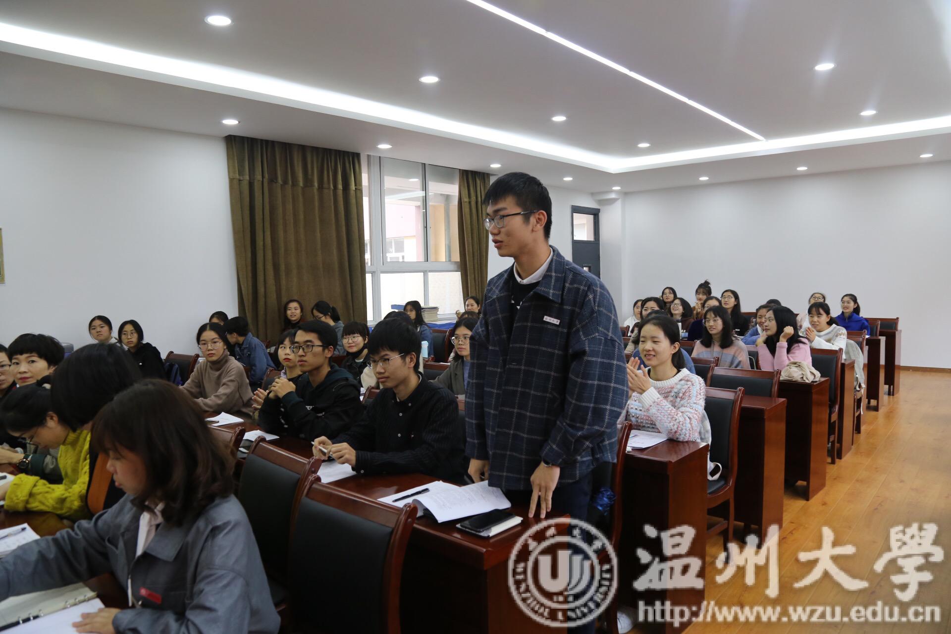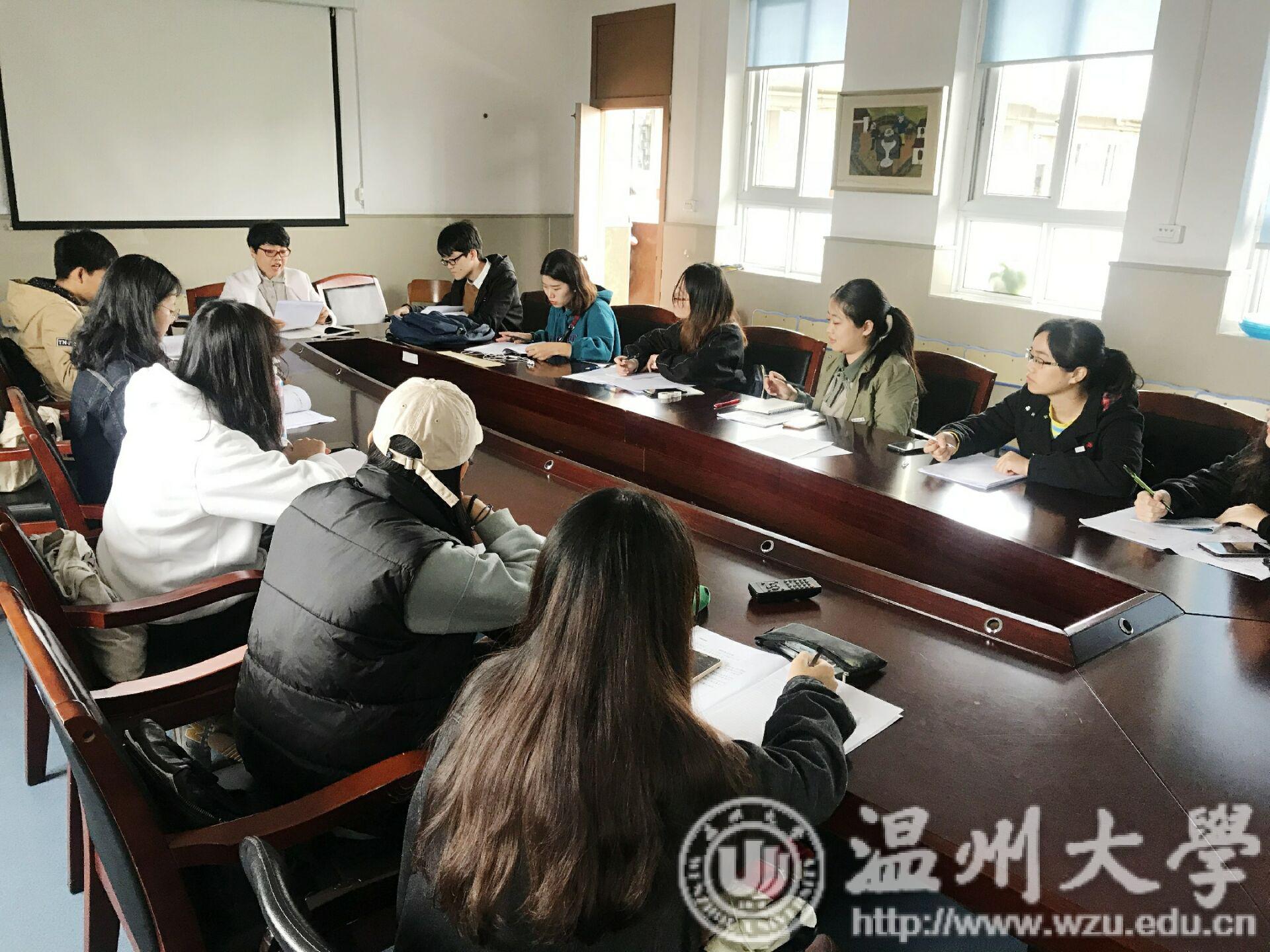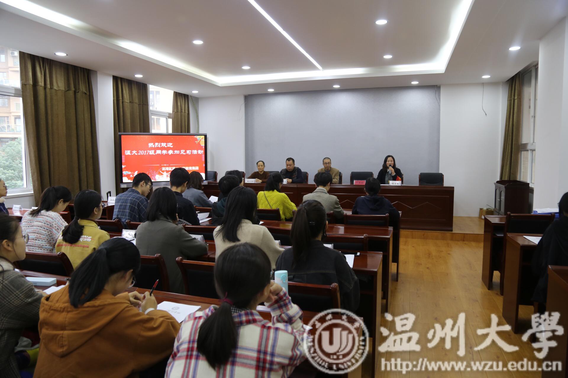 蒲鞋市小学见面会议程总共分为四项,首先由林爱微老师代表蒲鞋市小学向前来见习的学生们表示欢迎,并向同学们介绍了蒲鞋市小学的概况: 历史悠久、师资雄厚,是一所具有鲜明办学特色的实验性、示范性窗口学校。学校现有龟湖、桥儿头、黎明、双井头四个校区,校区之间的联系紧密,经常会一起组织活动。接下来林老师重点介绍双井头校区,双井头校区名师荟萃,特别是数学教研组曾获得温州市优秀教研组的荣誉称号。数学教研组中老中青三代集合,学习氛围良好,给新教师的发展提供了肥沃的土壤。关于办学特色,双井头校区的特色主要体现在弟子规和跆拳道两个方面。弟子规体现了学校在德育文化建设上所做的努力,意在培养学生良好的行为习惯,同时为了让家长参与到学校的德育文化建设,学校从2014年11月起,开展“幸福之家读书会”,至今已开展到第18期。跆拳道课程是学校的体育特色项目,一二年级的班级每周都会开一节跆拳道的拓展课。所以双井头校区也成为了鹿城区青少年跆拳道基地。可以说弟子规和跆拳道充分体现了学校全面育人的教学目标。