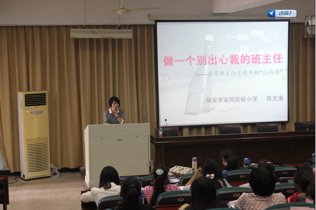 小教系在北校3幢101室举办了第二次名师大讲堂活动,瑞安市安阳实验小学有着22年丰富班主任经验的陈克素教师担任本次讲堂的主讲人,讲座主题是“做一个别出心裁的班主任”,本次活动由小教系主办,小教工作室承办,小教系教师谭莉博士主持。