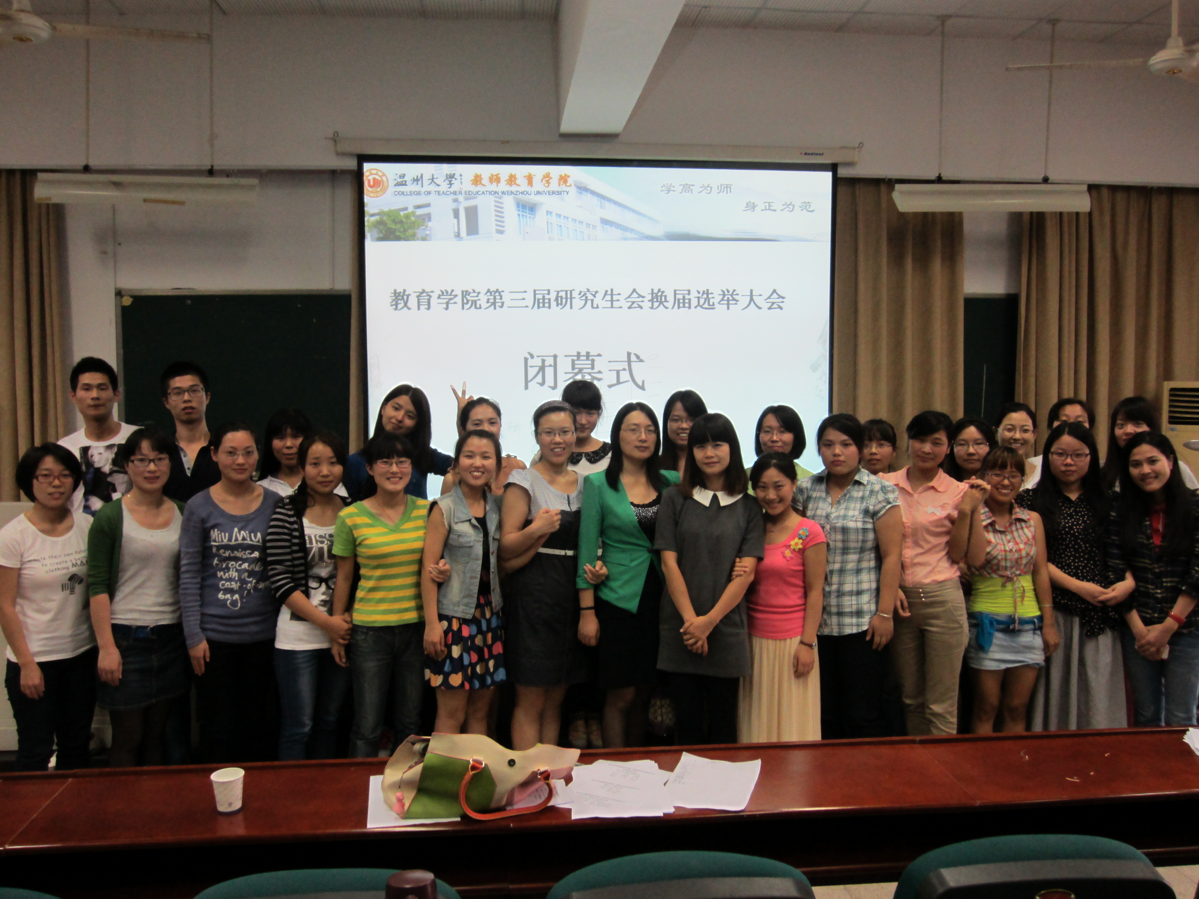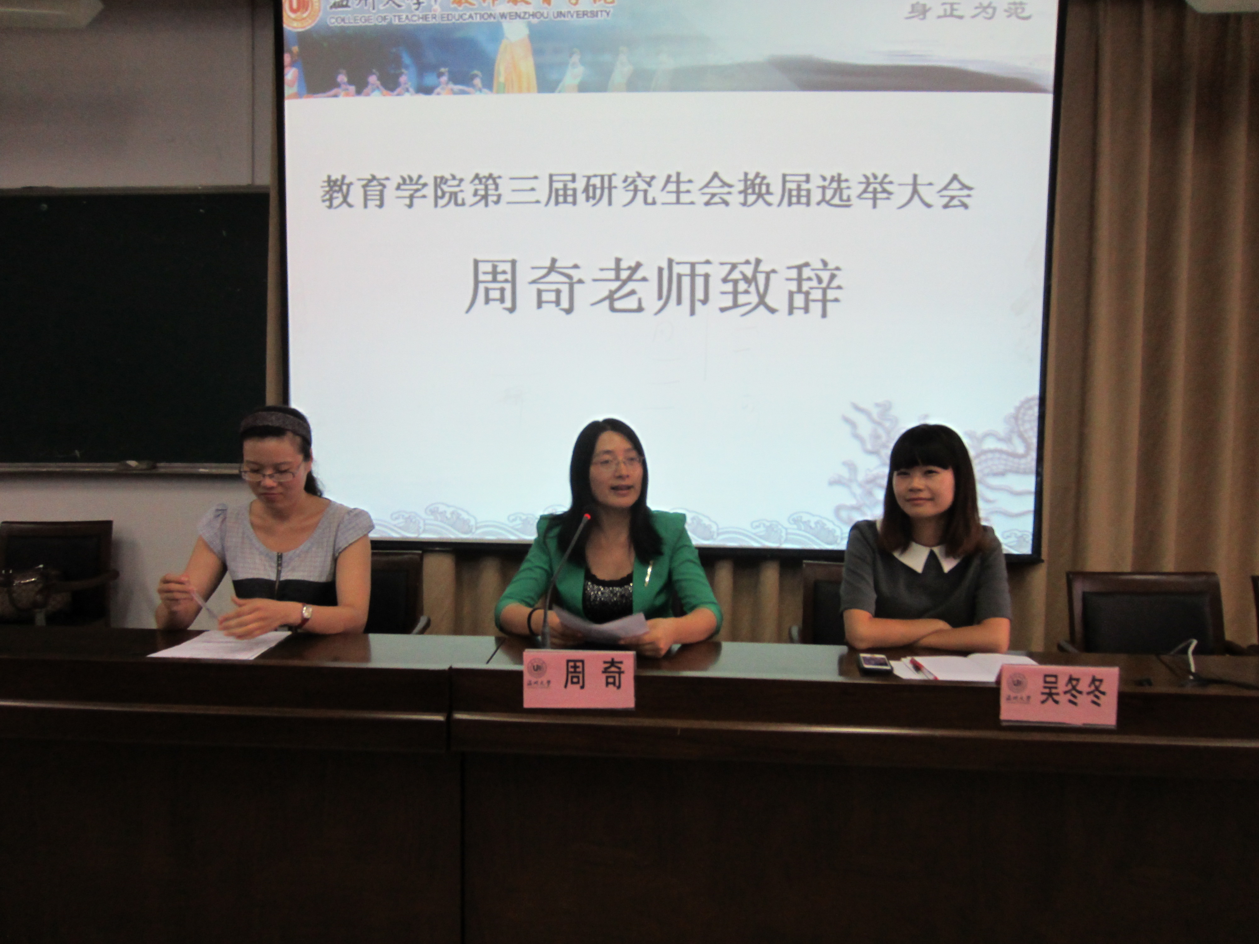 第三届研究生会换届选举大会在北校区3-101教室举行。本次大会主要目的是对2011-2012年度研究生会工作进行汇报并同时进行研究生会干部第三届换届选举,出席人员主要有教育系周奇老师、学生科吴冬冬老师以及教师91吃瓜