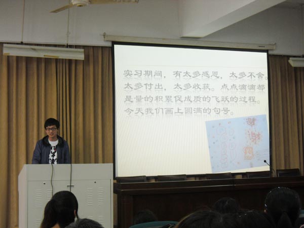 汇报会上,在温州实验小学实习的张凯莉同学,分散实习的马莎莎同学,在城南小学实习的於久益同学,在瑞安安阳实验小学实习的邢婷同学,在瑞安锦湖实验小学实习的汤艳婷同学,在温州建设小学实习的的姜莲敏同学和王怡璇同学,依次和大家交流本次小实习、研习的心得体会。大家体会角度各异,但都感受到实习和研习中真心的付出、沉甸甸的收获!在备课、上课到评课过程中,大家着实感受到了要上好一堂课的不易。在与小学生的接触中,大家都发现了那是多么鲜活和有个性的群体,需要细心观察、诚心相交。通过切实参与班主任的工作,大家对琐碎、繁杂的班主任工作有了新的认识,这是一份责任,更是一种幸福!
