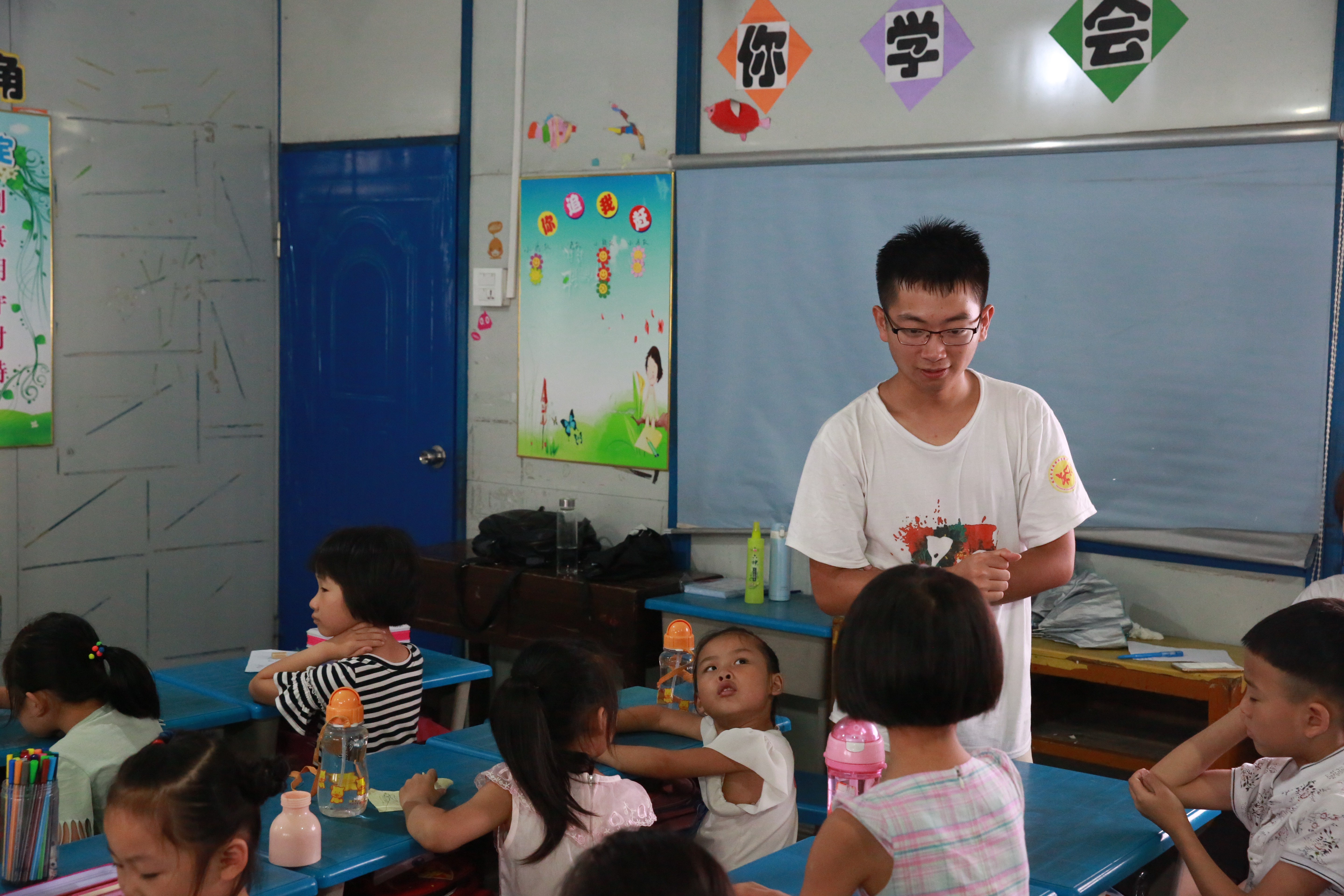 今天是7月15日,暑期实践天数已转眼变为“五”。炎热的天气并不能阻挡孩子和我们的热情,课堂上到处洋溢着积极和活跃的气氛。