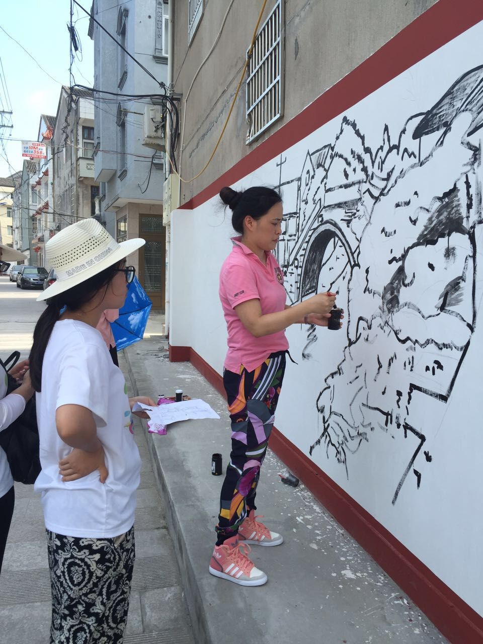 下午休息过后,我们青绘实践队员们又元气满满地投入到墙绘当中去。在陈铿指导老师的帮助下,我们的效率明显又提高了很多,而且从陈铿老师这儿学到了非常实用的绘画技巧,对于我们接下来几天的绘画帮助非常得大。经过这几天的绘画,我们更加的有经验,画画也越来越上手。陈铿老师也非常地尽职尽责,从下午开始就帮着我们一起绘画,一直到晚上七点多才吃晚饭,这让我们既感动又佩服。在吃饭的间隙,老师也非常亲切地与我们交流经验。吃过晚饭后,我们就抓紧时间打开投影进行描线,即使晚上蚊子一个劲地咬我们,但是我们青绘实践队员们毫无怨言,依旧一丝不苟地勾勒着每一条线,彰显了我们教师91吃瓜