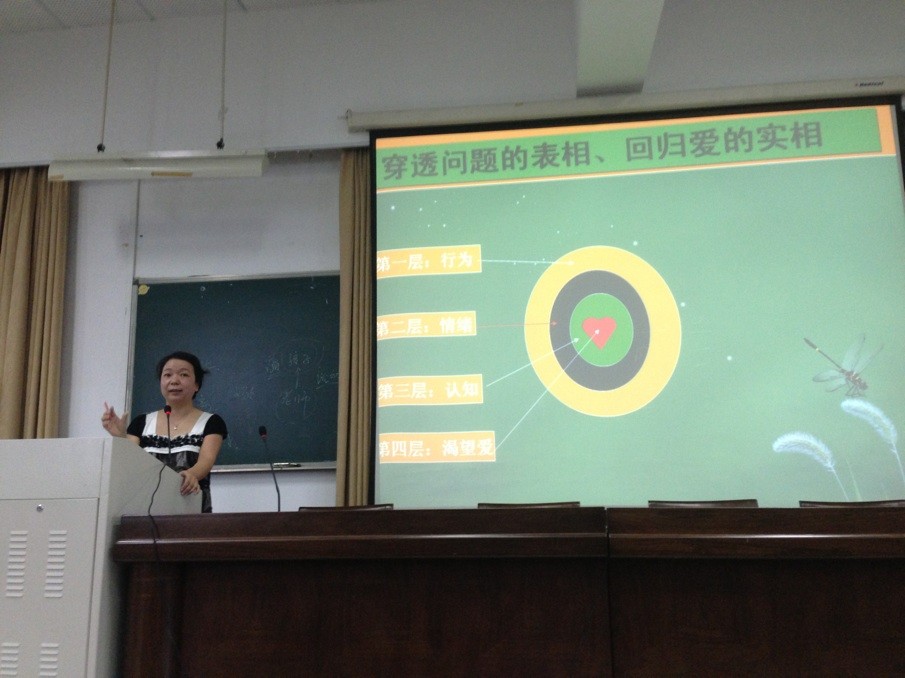 9月23号上午八点半开始上课,可同学们都早早地来到了教室,期待着吴郁葱老师的到来。吴郁葱老师到来后,先给我们讲了她最近的学习经历,只有不断学习,终身学习,才能不断前进。吴老师是专门给老师做心理健康培训的,在她充满激情的讲解下,我们首先了解了作为一名心理辅导员,我们的底蕴就是爱。然后,她引用了很多案例来启迪同学们思考,充分说明我们做心理咨询要穿透问题的表相,回归爱的实相。我们要注重心与心的联接。针对中小学的心理咨询,我们要做到知其病,守其爱。