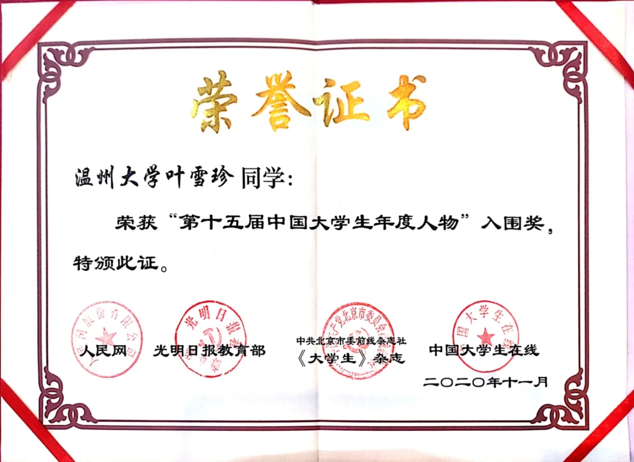 叶雪珍同志曾任团学干事、班长、知心总负责人和教院党服主任,均受到广大师生的一致好评,获得院优干、工作积极分子、优秀学生干事、党服之星等称号。她希望能带给学生的是更广阔的世界,因此她广泛学习,以比赛拓眼界。在挑战杯竞赛获校特等奖、省三等奖,互联网+比赛获校金奖、省银奖的同时,叶雪珍也深入学术研究并成功获得省新苗立项、校课题立项。