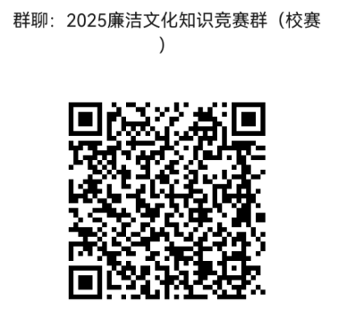以学院为单位组建参赛队伍(三位同学为一队),每个学院上报1支队伍,请各学院于11月19日(周三)17:00前将参赛选手名单(见附件)发送至承办单位邮箱[email protected],并扫码加入【2025廉洁文化知识竞赛】微信群收取题库。