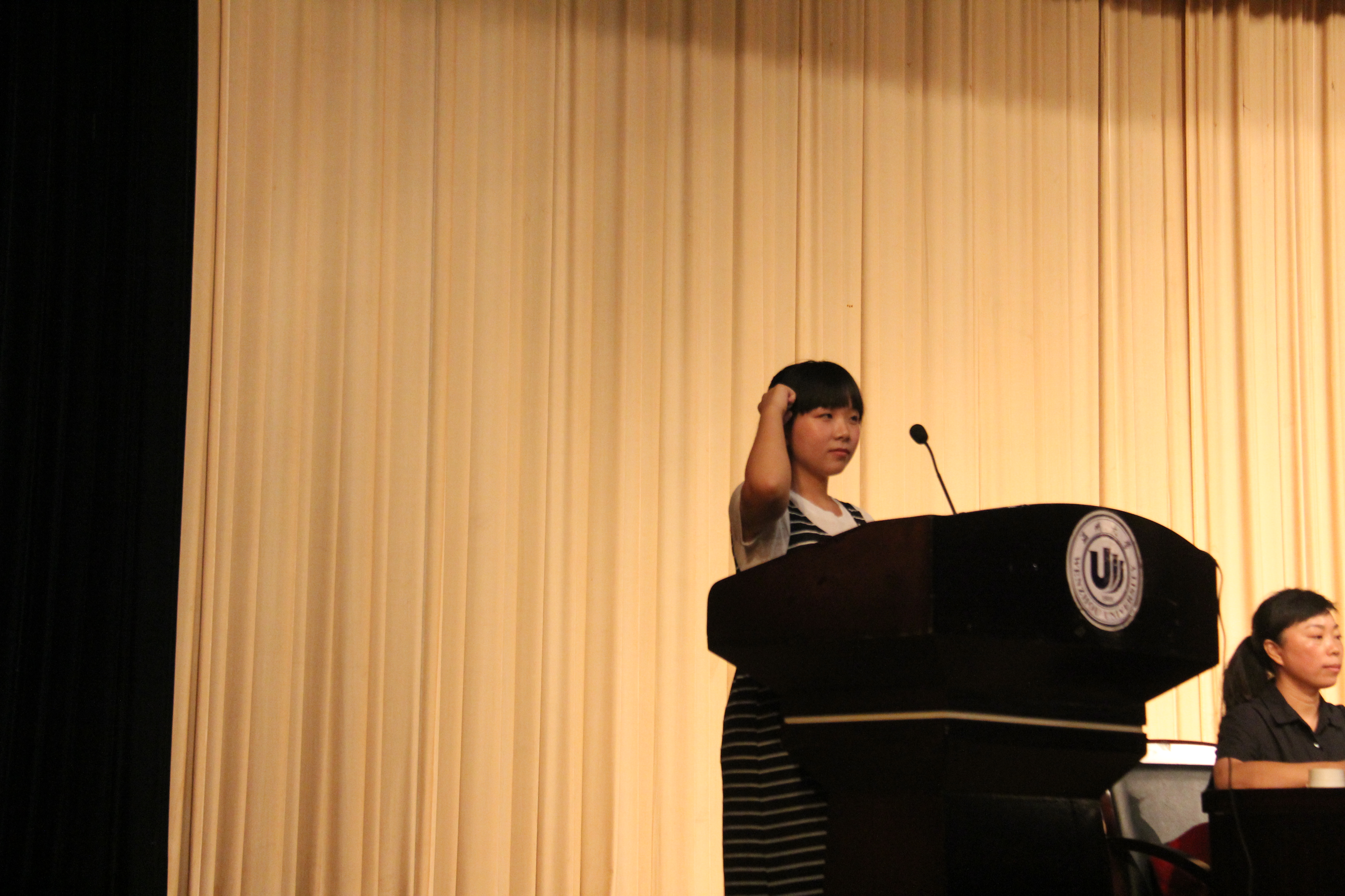 感到骄傲的人!新生代表16小教1班的温心怡同学发言,她表示在大学生活正式开启之时,他们将唤醒内心深处的梦想,在这个追梦的地方一起为梦想而奋斗,在大学四年中成就更好自己的决心。之后,全体新生进行了入学宣誓,“我愿以青春年华融入美丽温大,珍惜美好岁月,铸就身心健康,传承师辈德业,增进智慧学养……”会场中回荡着同学们的激昂话语和满腔热情,这也将开学典礼推向高潮。