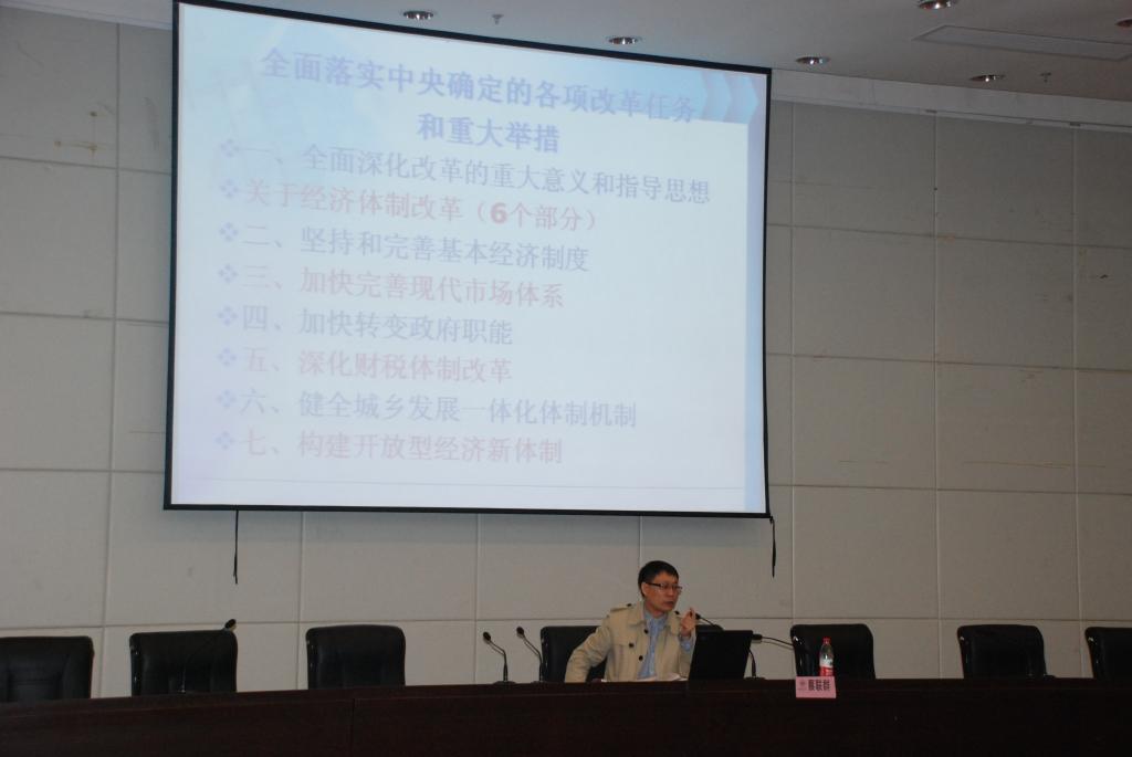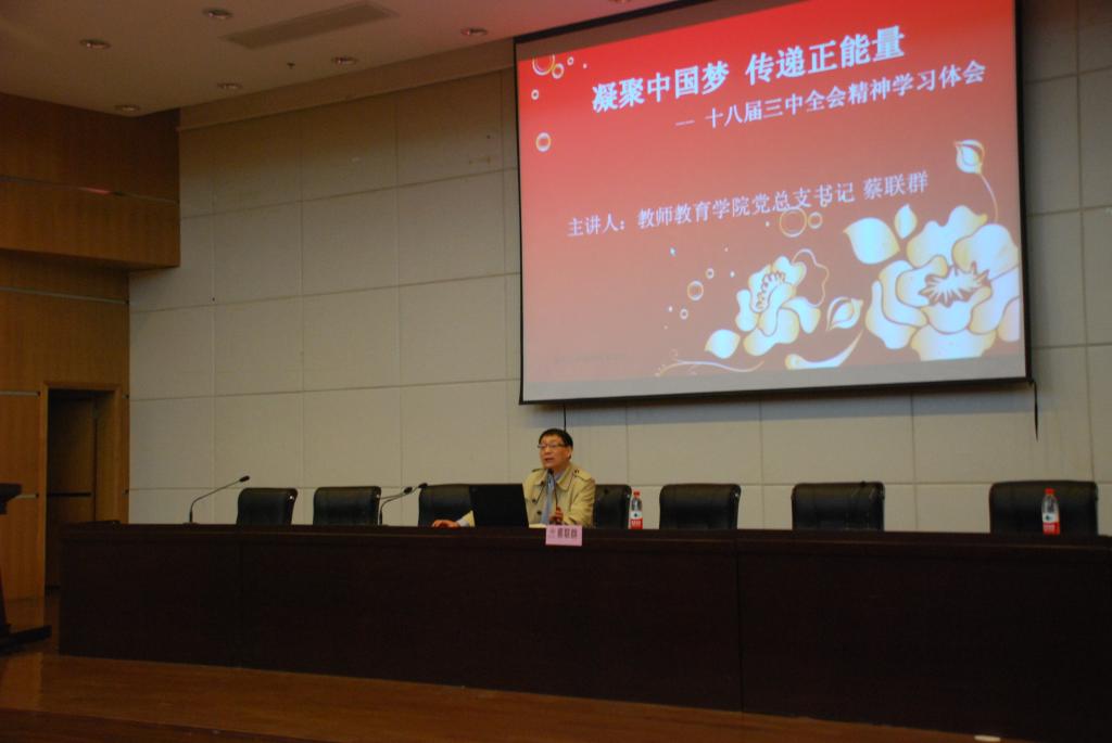 最后蔡老师以习近平总书记在十八届三中全会闭幕中的一段话作为结尾——“中国梦归根到底是人民的梦,必须紧紧依靠人民来实现,必须不断为人民造福”,希望作为未来人民教师的我们能在今后多多关注国家实事,在以后的工作中贡献自己的一份力。蔡书记以幽默诙谐的语言魅力与我们分享了十八届三中全会精神的学习体会,传递了“道路自信、理论自信、制度自信”和“凝聚中国力量,实现中国梦”的正能量,大家意犹未尽,报以热烈的掌声。