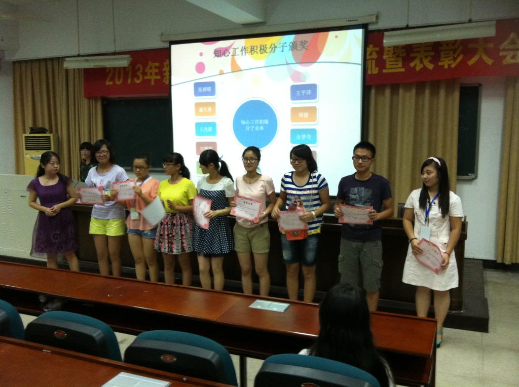 首先,嵇小怡副书记给大家带来了新学期的寄语。她向新队员们介绍了知心姐姐的历史,日常志愿者活动,以及知心工作理念,使刚加入知心姐姐的新成员们对知心姐姐的认识更加深入,对以后的知心志愿者活动更加期待。此外,嵇书记就知心姐姐今后的工作走向做了简单介绍,包括知心姐姐工作理念的提炼、知心姐姐二十周年年庆筹备工作、知心姐姐活动载体和形式的创新等。嵇书记向同学们提出了自己的希望,希望“知心姐姐”们能够将志愿服务工作与自己的专业相结合,在服务过程中不断积累专业知识与技能;第二,希望他们能够将志愿服务与个人品德相结合,在活动过程中主动思考,积极行动,敢于担当,提升社会责任感;第三,希望同学们能将志愿服务与社会需要相结合,促进社会风气的改善。会议第二项议程,表彰2012学年“知心姐姐”工作积极分子。嵇小怡书记向张雨晴等9名同学颁发了荣誉证书。紧接着,留守队,民工队和海岛队的三个代表与新同学们交流了各队的工作内容和特色,许多老成员都分享了自己参与活动的心得。