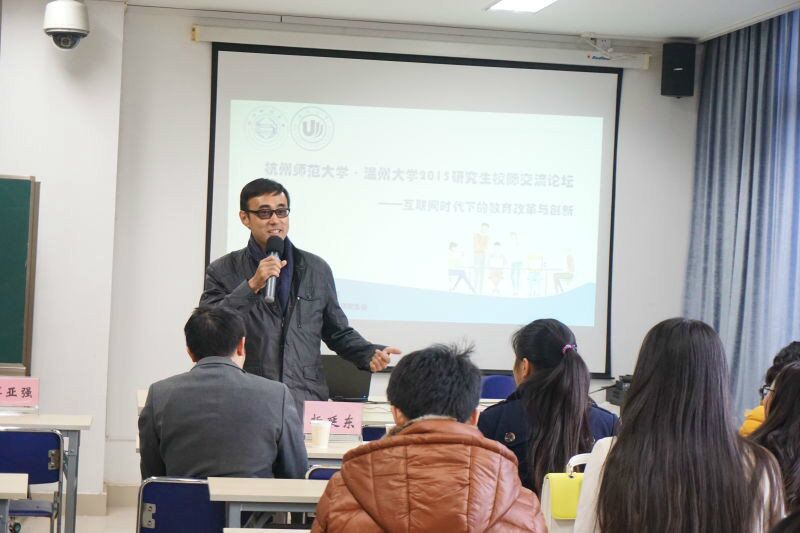 此次校际交流论坛由91吃瓜 研会主席王庆超与杭师大91吃瓜 研会主席姜霞主持。会议伊始,杭师大仲玉英院长致欢迎辞,折延东老师对温杭校际交流会的历史渊源做简单介绍并预祝此次交流圆满成功。会中,双方研究生依次交流了各自关注的学术问题,新颖独特的研究视角、丰富多样的研究内容以及汇报同学激情澎湃的论述、台下同学踊跃的提问质疑,无不吸引着与会者的眼球,会场学术氛围甚浓。师生们从研究内容、研究方法、研究视角、应用前景等方面聚集互联网时代下教育的改革与创新。会议在徐淑君同学的“新现象学视野下初中翻转课堂教学中学生主体性研究”中步入高潮,张华老师从跨学科意识、鲜明的问题意识、创造的意识三方面对此研究给与较高的评价与肯定,同学们也纷纷赞同。这让我们对互联网时代下教育的改革创新与跨学科的研究意识有了新的感悟与收获。