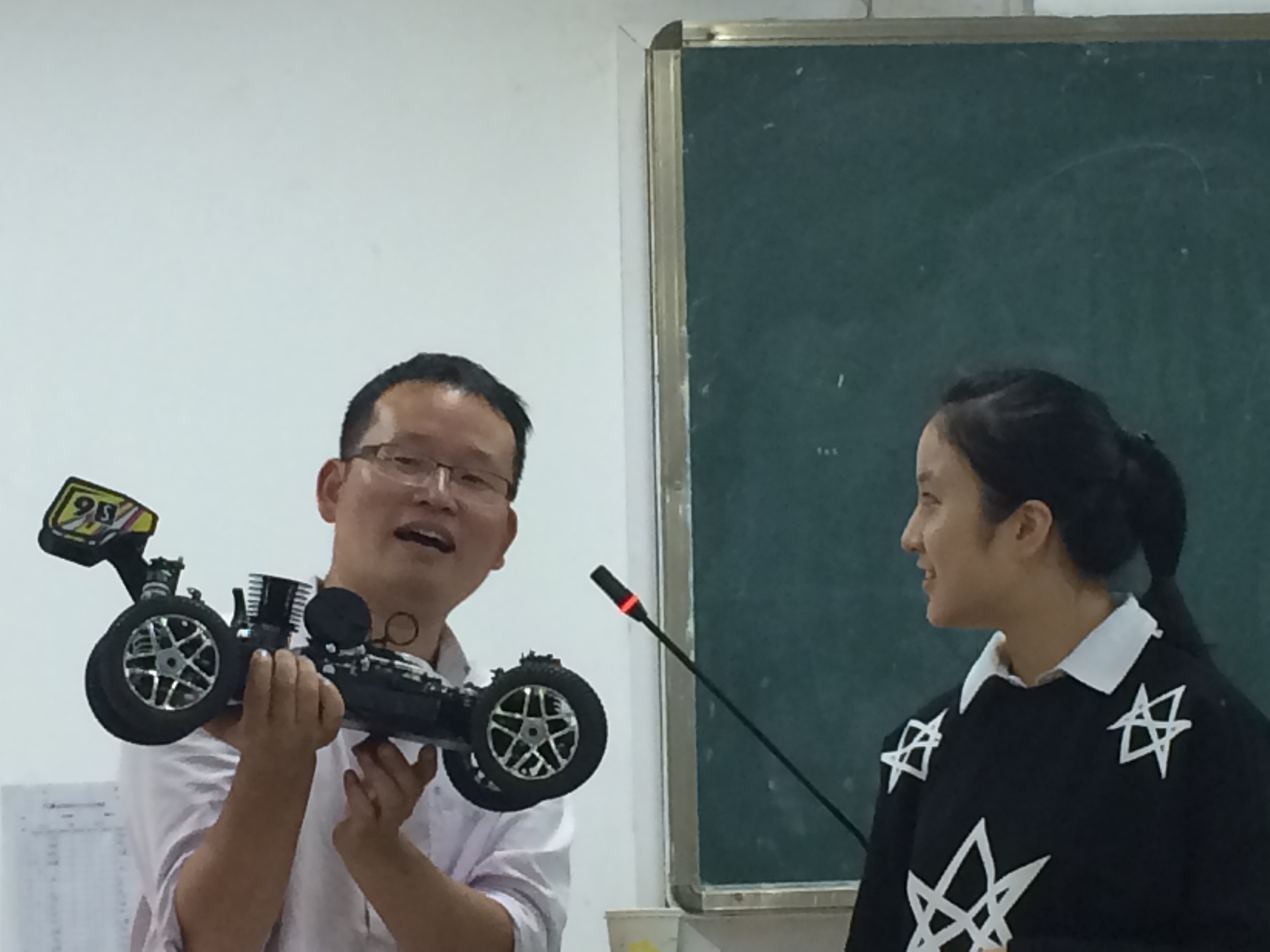 在谈到实物授课时,陈耀老师拿出了飞机、赛车模型,让大三学生们即兴上课,同时也考验了同学们的专业能力。虽然大三学生们略显羞涩,但陈耀老师还是积极鼓励大家踊跃参与。13级全体同学也充分发挥了自己的想象,针对相应的模型简单地进行了课堂内容的设计。而后,陈耀老师向我们介绍了三个家庭实验室的选题领域:生活、想象、学习,并且举很多有启发性的例子,比如:洋葱罩,防作弊视力表等等,告诉我们从生活中发现问题,在想象、学习、实践中解决问题。