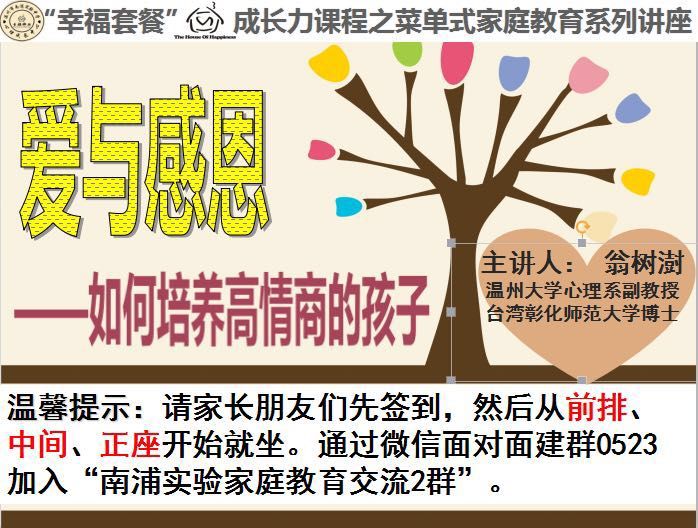心理系老师、温大心理咨询与测评中心资深心理咨询专家翁树澍博士前往温州市南浦实验中学,为七、八年级240名家长开展了幸福套餐家庭教育系列讲座的第二场,主题为《爱与感恩——如何培养高情商的孩子》讲座。整个会场座无虚席,家长们聚精会神聆听、沉思、笔记;互动环节提问踊跃、交流顺畅;旁听的教师及本校教育实习同学都感到都受益匪浅。