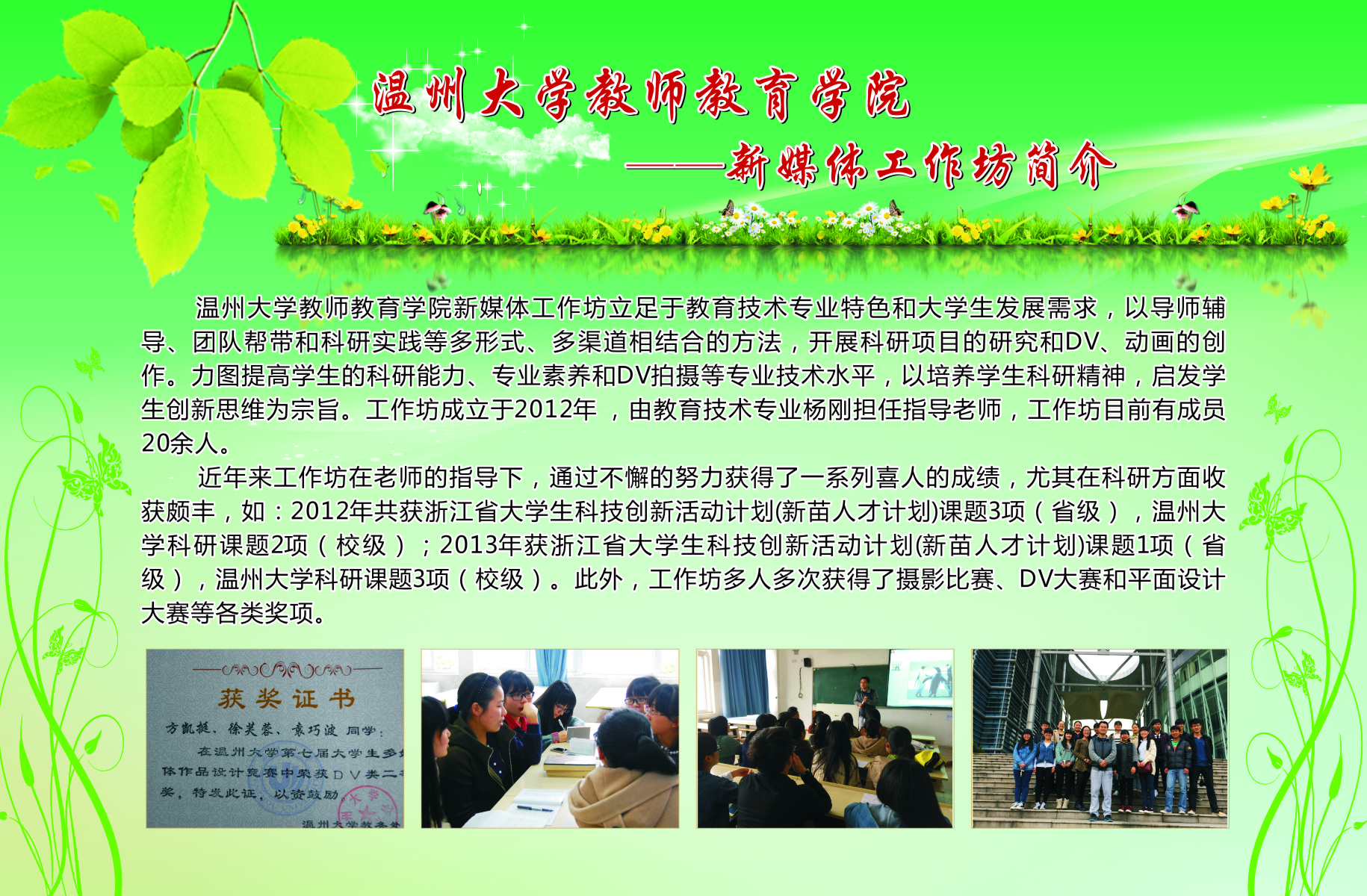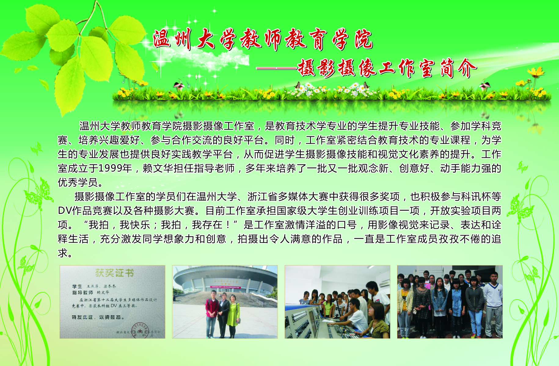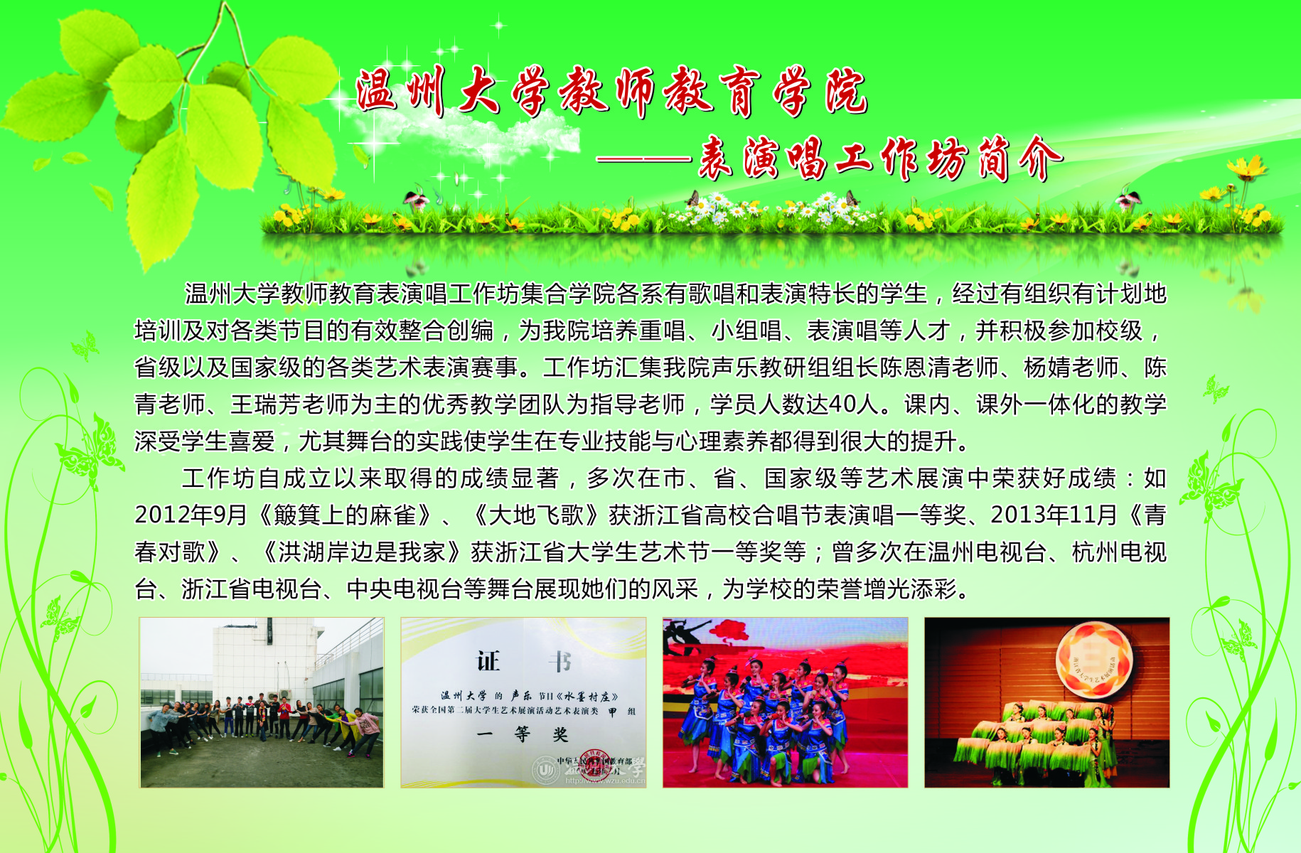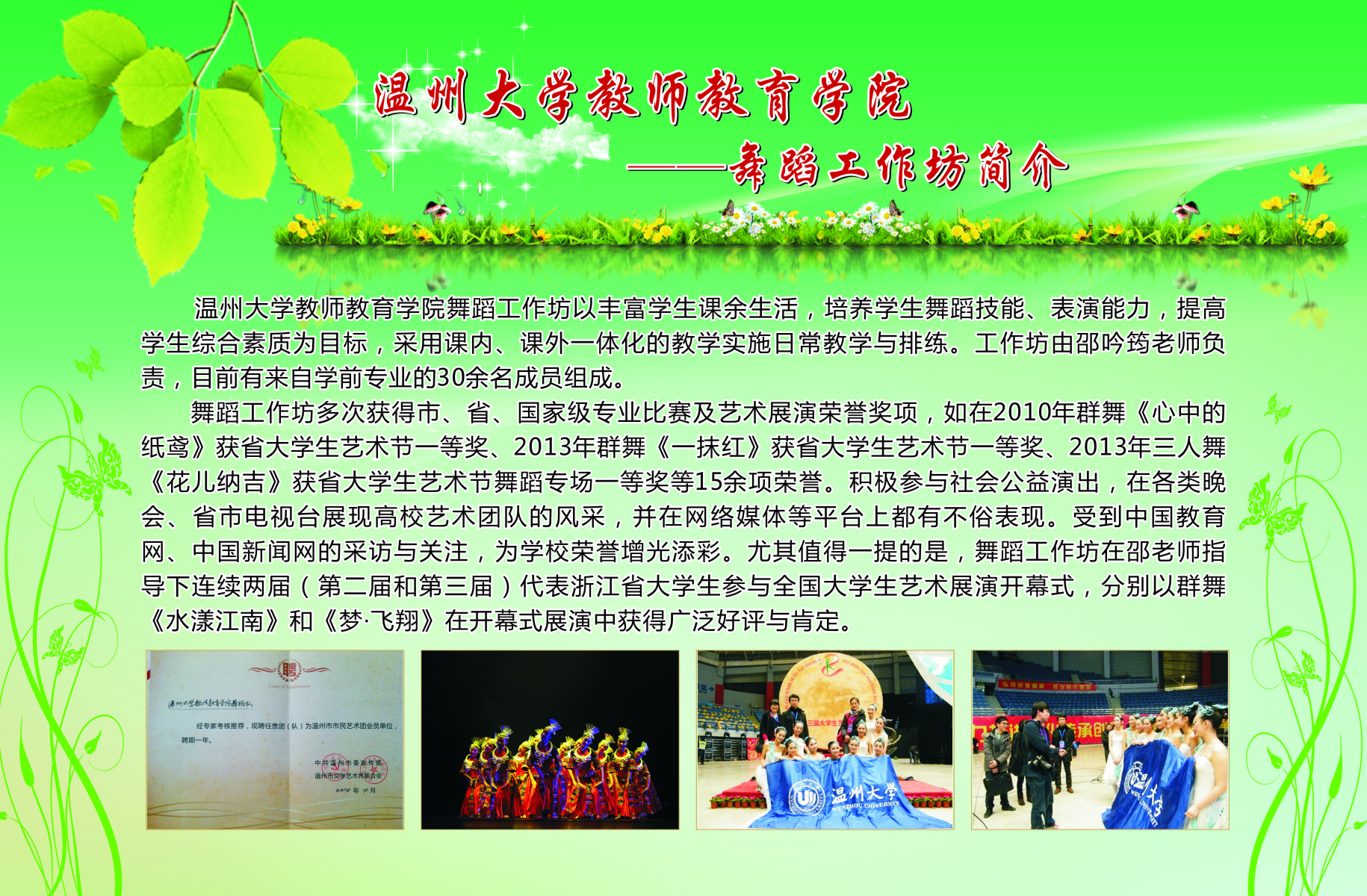 13个学生专业工作坊的简介、师生合影、培训及成果照片等。学院专业工作坊在各位工作坊专业老师指导下,学生在自身综合素养及品质得到提升的同时,参与各类省市、乃至全国的比赛,扩大学校、学院的声誉。近三年91吃瓜