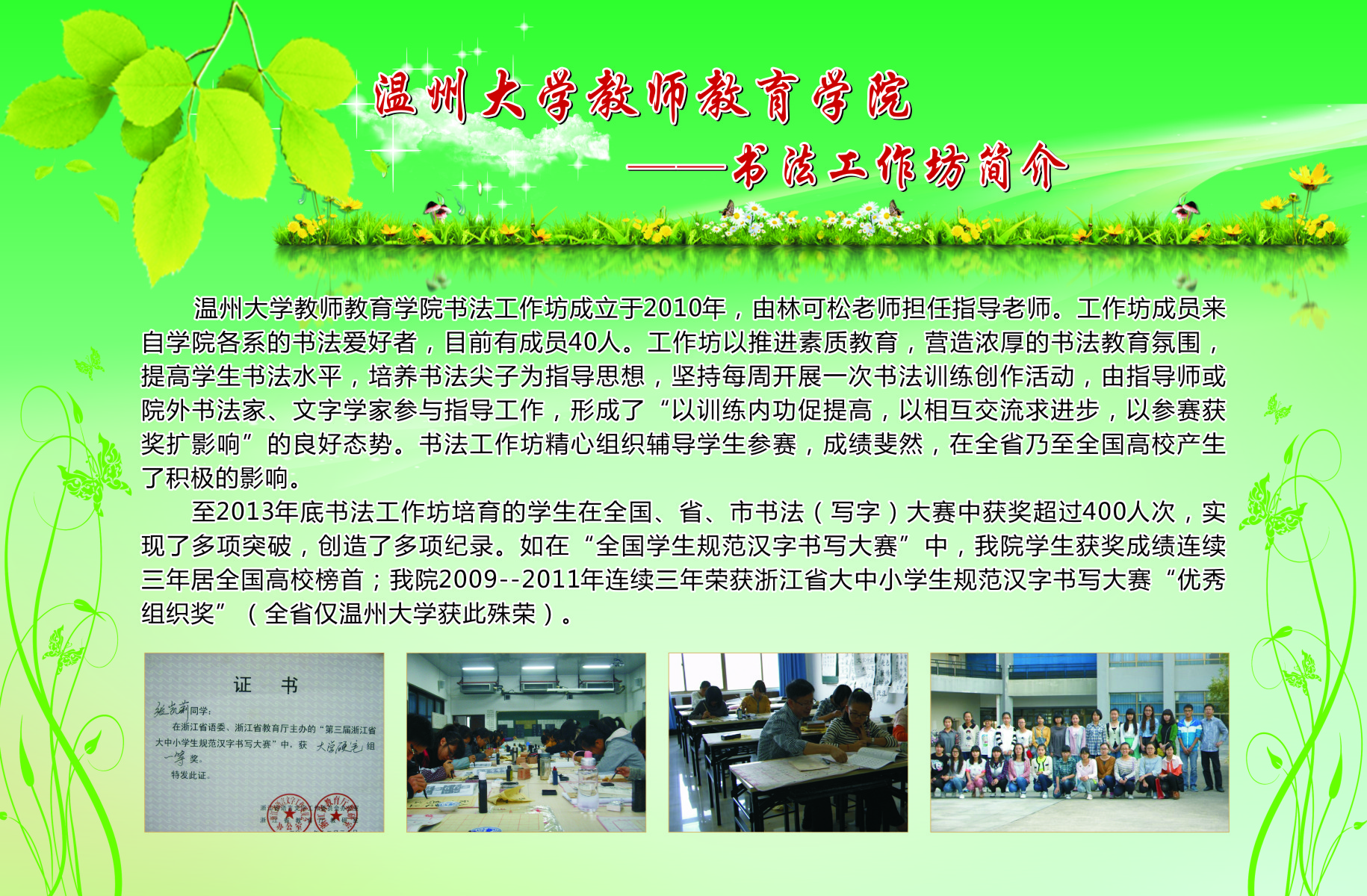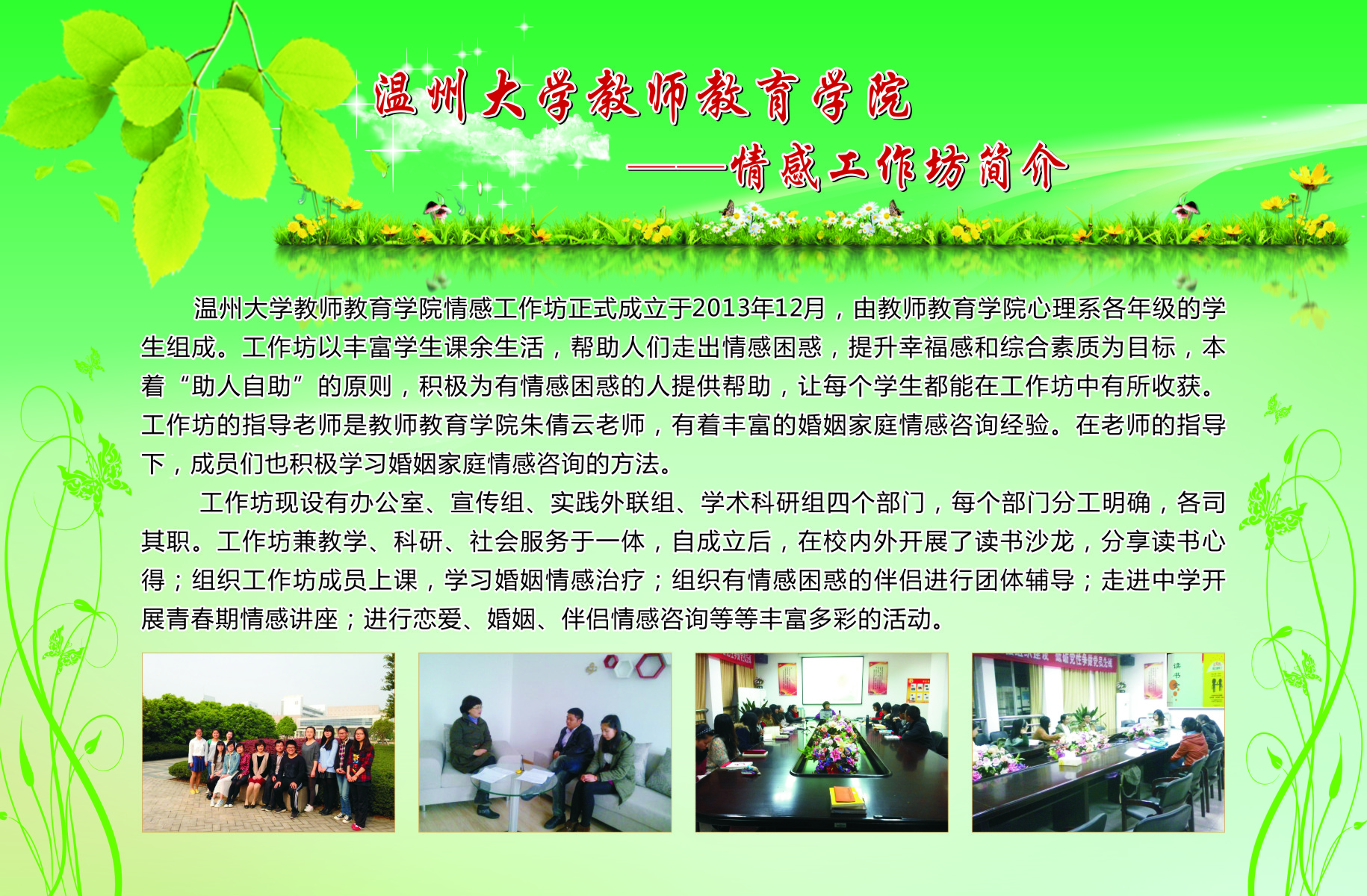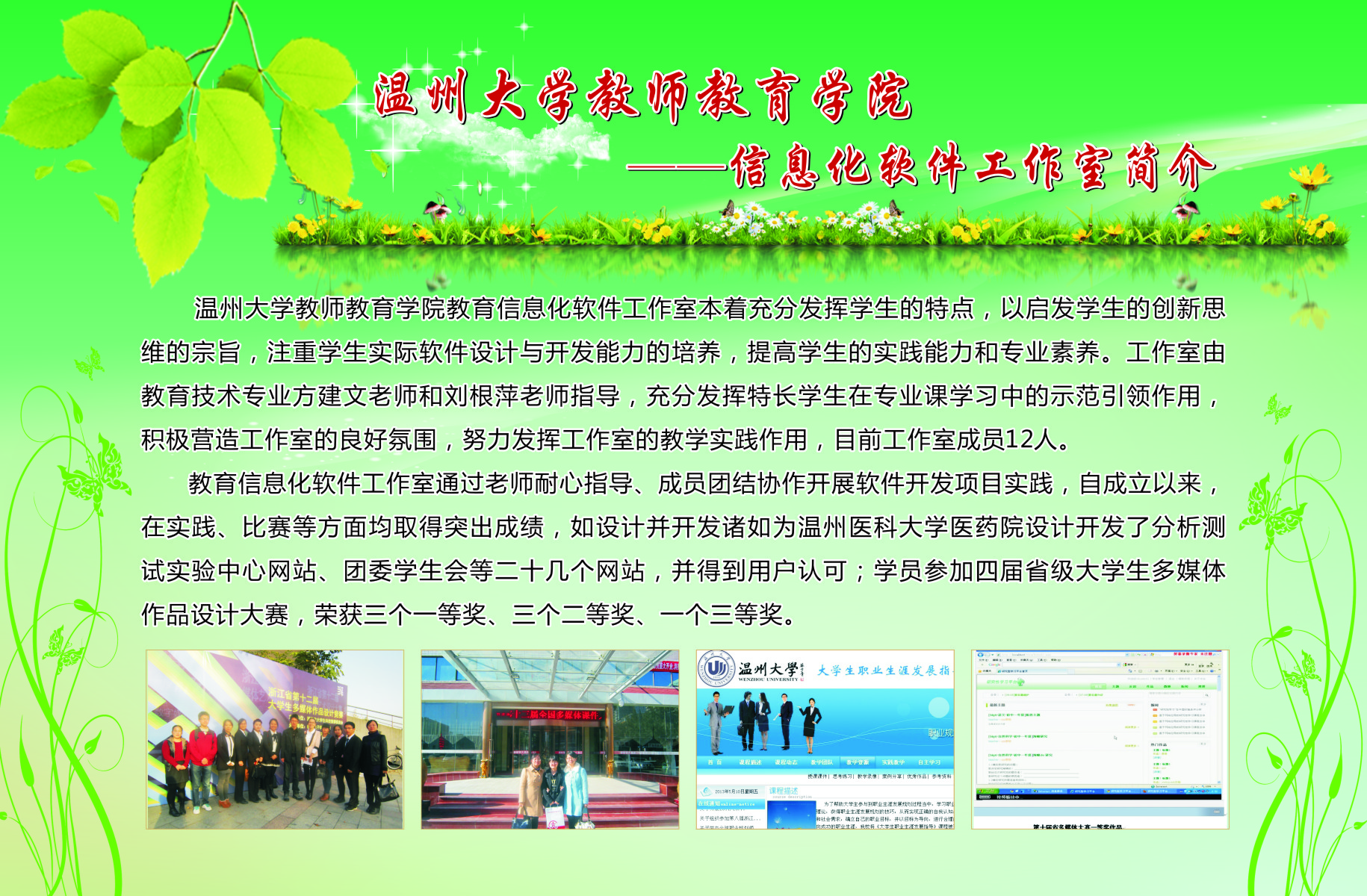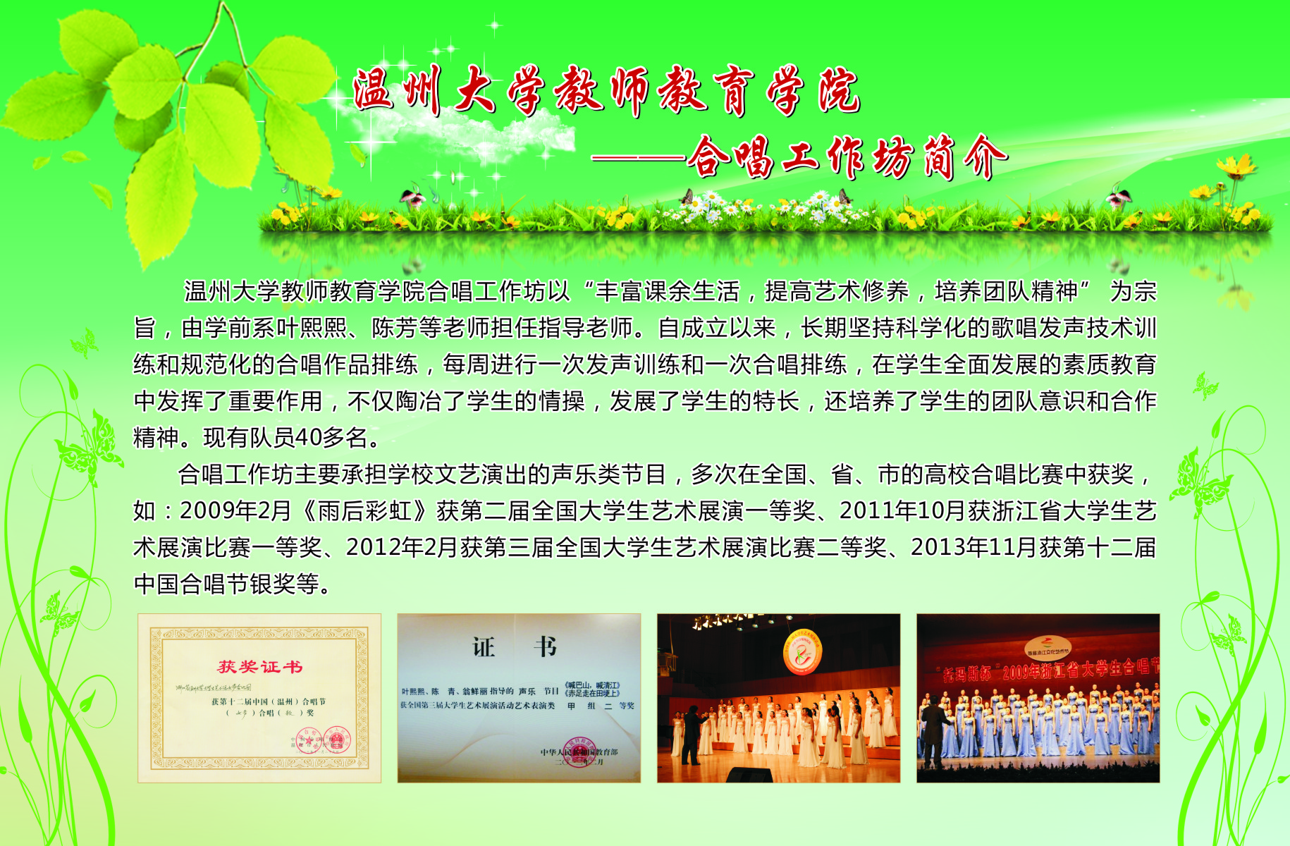 13个学生专业工作坊的简介、师生合影、培训及成果照片等。学院专业工作坊在各位工作坊专业老师指导下,学生在自身综合素养及品质得到提升的同时,参与各类省市、乃至全国的比赛,扩大学校、学院的声誉。近三年91吃瓜