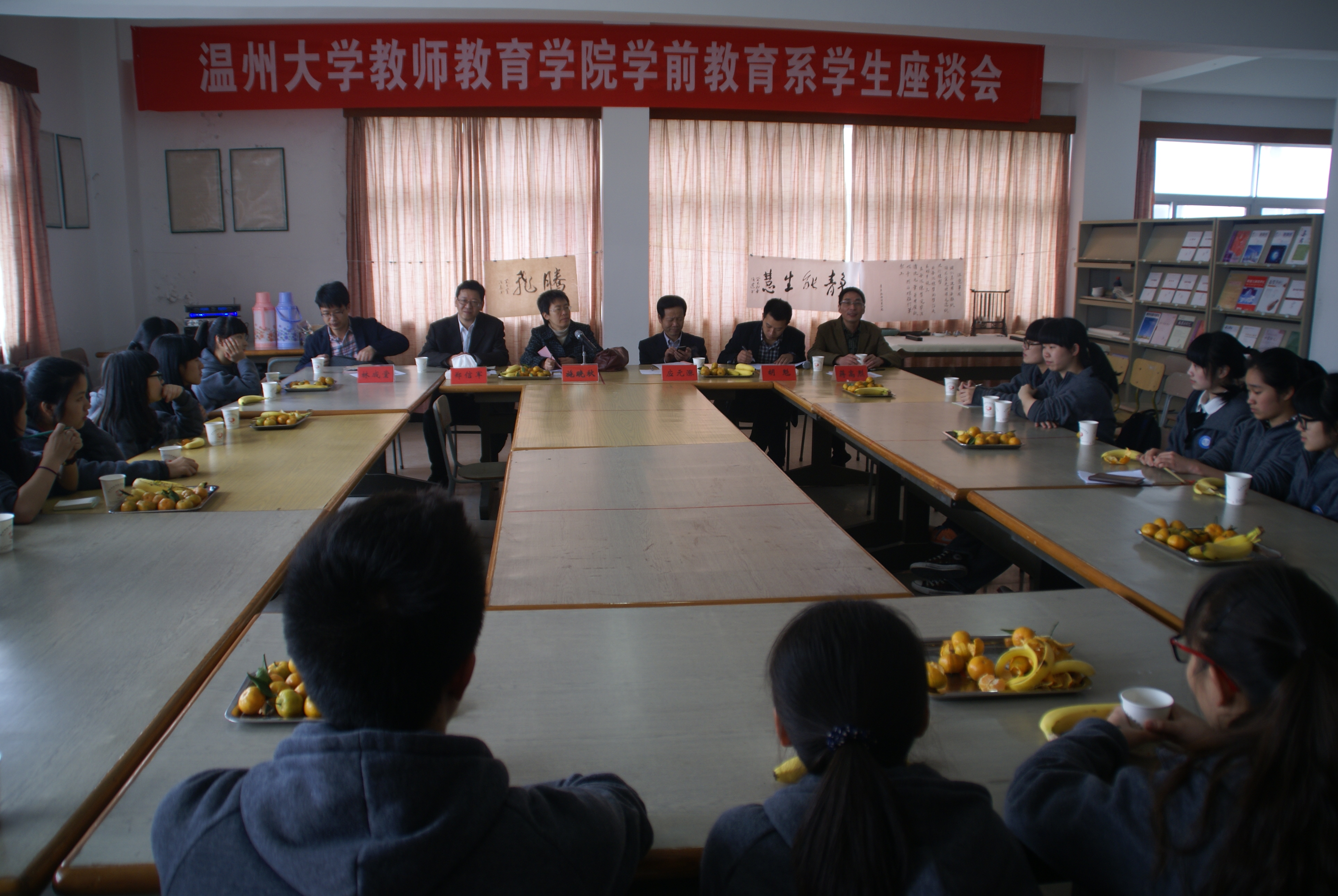 随后,调研组兵分两路,一组由施晓秋,郑信军、胡魁组成,与学生代表进行座谈会,了解学生的学习、生活情况,学生代表发言踊跃,表示对学校教学非常满意,同时对食堂卫生、饭菜质量、手机使用等一些日常生活问题提出意见与建议。最后施处长充分肯定了乐清教学点的教务管理工作,并强调安全卫生工作是学校管理的重中之重,希望常抓不懈。温州市教育局高教处应元涨处长共同参加调研活动。