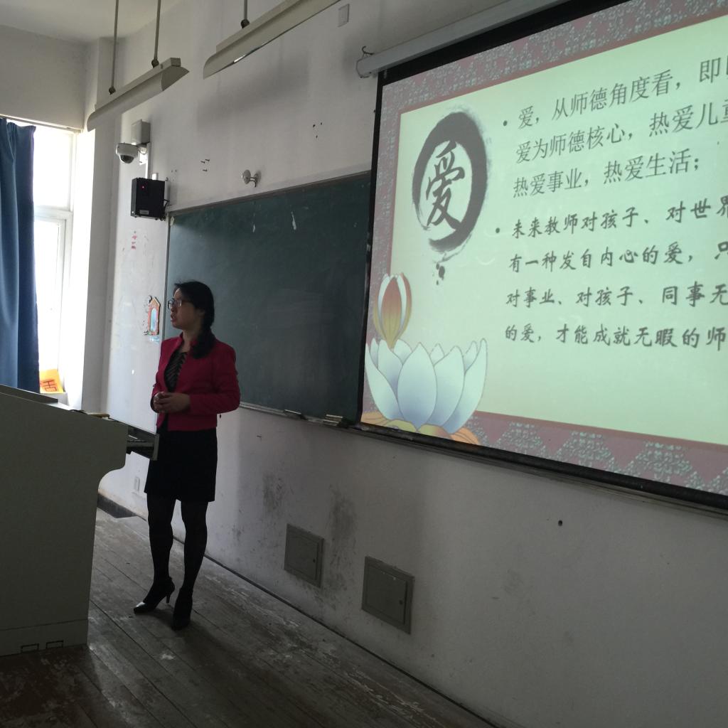 随后陈秀雅老师从创建优良学风、争做优秀学子和凝练师范气质、提升文化氛围两方面对同学们学习期间请假制度、学风建设、争优评比及特色活动做了要求和介绍,并与全体同学分享了“哟……哟……教师教育最优秀”的口号。