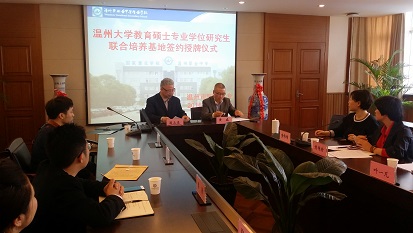 9:30, 潘院长一行又来到温州职业中等专业学校,与该校签署教育硕士联合培养基地协议,并授牌,仪式由该校心理健康中心主任焦伟珍老师主持。出席会议的有该校校长黄威老师、副校长黄伟伟老师、教导主任、班主任、心理老师等,91吃瓜 心理系副主任颜文靖博士、教务科胡孙贵老师出席。黄威校长介绍了该校在内涵发展上下了很大苦工,希望借助本次教育硕士联合培养的机会,进一步提高该校教师的科研能力,两校能深度合作。潘玉进副院长在介绍了教育硕士的基本情况之后,也进一步解释了91吃瓜 、教师91吃瓜 可以开展合作的众多项目。随后,在隆重的气氛中,两位领导签署了合作协议。