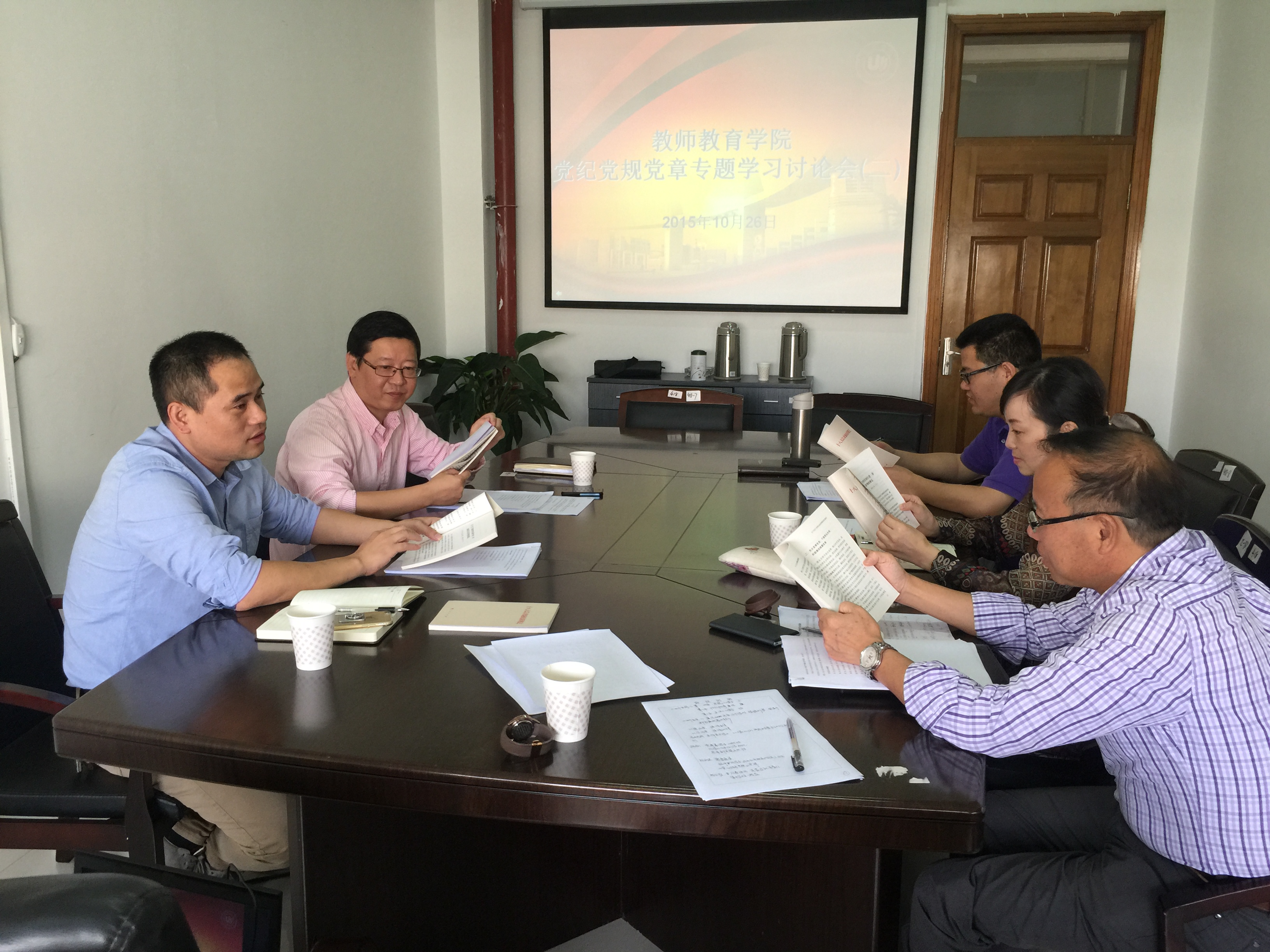 党总支书记杨立淮同志在南校区9A412会议室主持召开两次学院处级党员干部党章党规党纪专题学习讨论会。学院处级党员干部郑信军、彭小明、胡瑜、杨丽君等同志参加了两次集中学习讨论会。