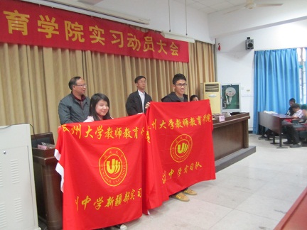 会议首先由彭院长做动员发言。彭院长结合自身多年的带队实践经验和中教法的专业知识,对本系实习的意义、要求和注意事项作了布置。发言完毕之后,彭院长和各系主任为本次实习的各个实习队伍颁发了队旗,并鼓励大家带着温大的师范精神出征。