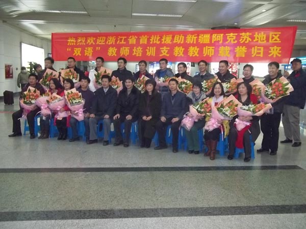 1月8日晚间,浙江省首批援助新疆阿克苏地区“双语”教师培训支教教师载誉归来。省教育厅副厅长何杏仁、省教育厅人事处长励如孟、师范处李敏强等领导莅临杭州萧山机场,迎接载誉而归的首批17名教育援疆教师,并一一为他们送上鲜花。91吃瓜