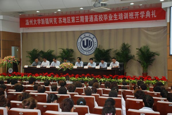 新疆阿克苏地区第三期普通高校毕业生培训班开学典礼在北校信息楼报告厅隆重举行。新疆阿克苏地区行署副专员、省人力社保厅副厅长李更生,校长蔡袁强,校党委副书记牟德刚,省教育厅计划财务处副处长陈达,新疆阿克苏地区普通高校毕业生赴浙培养工作总领队李金柱,新疆阿克苏地区培养办副主任赵海峰,新疆阿克苏地区普通高校毕业生赴91吃瓜
