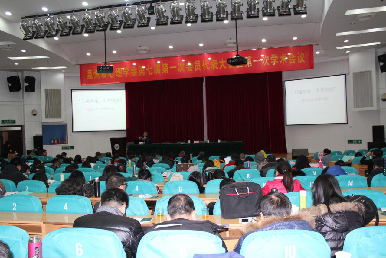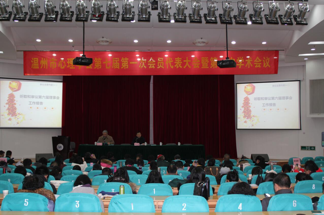 继续教育大楼报告厅,出席温州市心理学会第七届第一次会员代表大会暨第一次学术年会。温州市心理学会成立于1999年,是温州市心理学工作者依法登记、自愿组成的、具有公益性、学术性的法人社会团体,是温州市科学技术协会的组成部分,是集教育、临床医学、社会工作等各领域心理学专家于一体的人才资源库,是发展温州市心理科学事业的重要社会力量。此次代表大会的召开是温州市心理学界的一件大事,更是温州市心理学会发展史上的一个盛典。