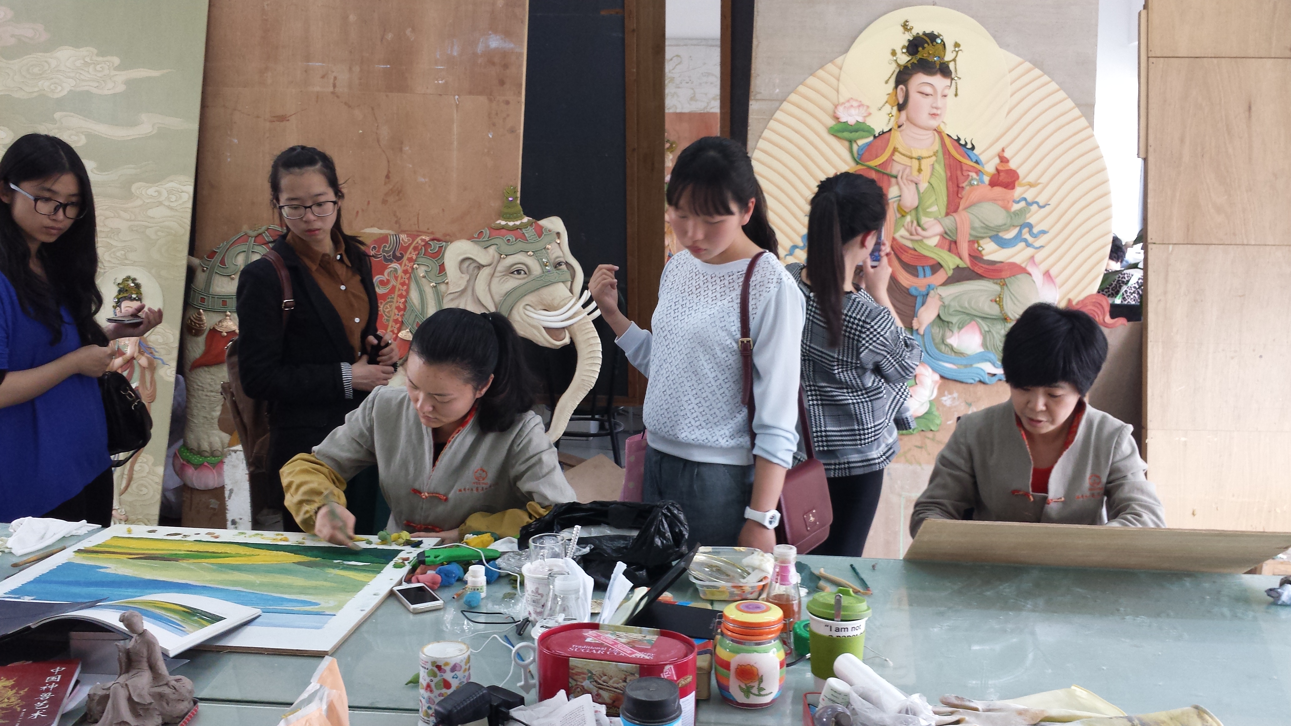 在陈所长的热情引导下,学员们观摩了佛教人物、山水、花鸟等各种大小不一、风格各异的瓯塑作品。陈所长还简单地介绍了瓯塑技艺的独特之处,使学员们对瓯塑这门民间艺术有了更多的了解。在瓯塑研究所中,有许多正在进行瓯塑作品创作的艺人,美术工作坊的成员怀着好奇和热爱,认真安静地站在他们身边观察着他们的制作瓯塑作品的过程。他们使用大小型号不一的独特的木质工具,将瓯泥一点一点地塑到自己的作品上。艺人们精湛的技术和耐心使我们佩服不已,那些或鲜丽或恢宏或清新的瓯塑作品也让我们惊叹。