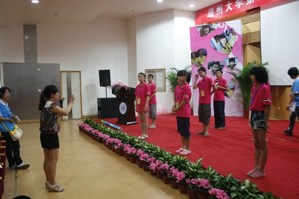 闭幕式现场要用很多气球来装饰,营员们就吹气球,绑气球,把一串串气球挂满在雁山厅内的各个角落。小营员们一边准备着气球装饰,一边聊着最近开心的事。虽然准备工作很辛苦,但是在整个准备工作现场不时仍传出此起彼伏的笑声。各种准备工作在进行一段时间后,小营员们又进行朗诵比赛的排练。诗歌朗诵是本次闭幕式的一个重磅节目,它是由有十几个小营员合作完成的。一句句“为什么”,牵动着大家的心弦,勾起我们心底那份淡淡的失落,但这几天夏令营的生活似乎已经给了他们很多勇气,诵读语气中已经透露出几分对生活的坚定和对未来的信心。