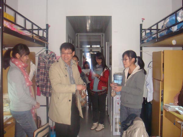 每到一个寝室,老师们都会关心的询问学生的近况,了解学生的实际困难。学院党总支蔡联群书记在寝室里还和学生聊到了很多有关学习的事情,他说:“马上临近考试了,大家一定要好好复习、充分准备、积极应考,冬至日快到了,你们都没法回家,我们学院的老师给你们送汤圆来了,希望你们冬至节快乐”。同学们在欣喜的同时又充满着感激,也声声祝愿学院老师“冬至日快乐”。师生间其乐融融的气氛驱散了所有的寒冷,笑声充满了整个房间,我们也用相机记录下了这温馨的时刻,永远无法忘怀的一刻。接到热乎乎的汤圆,学生们感动之余,纷纷表示,虽然在冬至日里,我们没法回家与亲人团聚,但我们大家都得到了学院老师们的关心,这小小的汤圆让我们在这个没有亲人陪伴的冬至日多了温暖与温馨。我们一定好好复习充分准备,争取向学院交上自己完美的答卷。