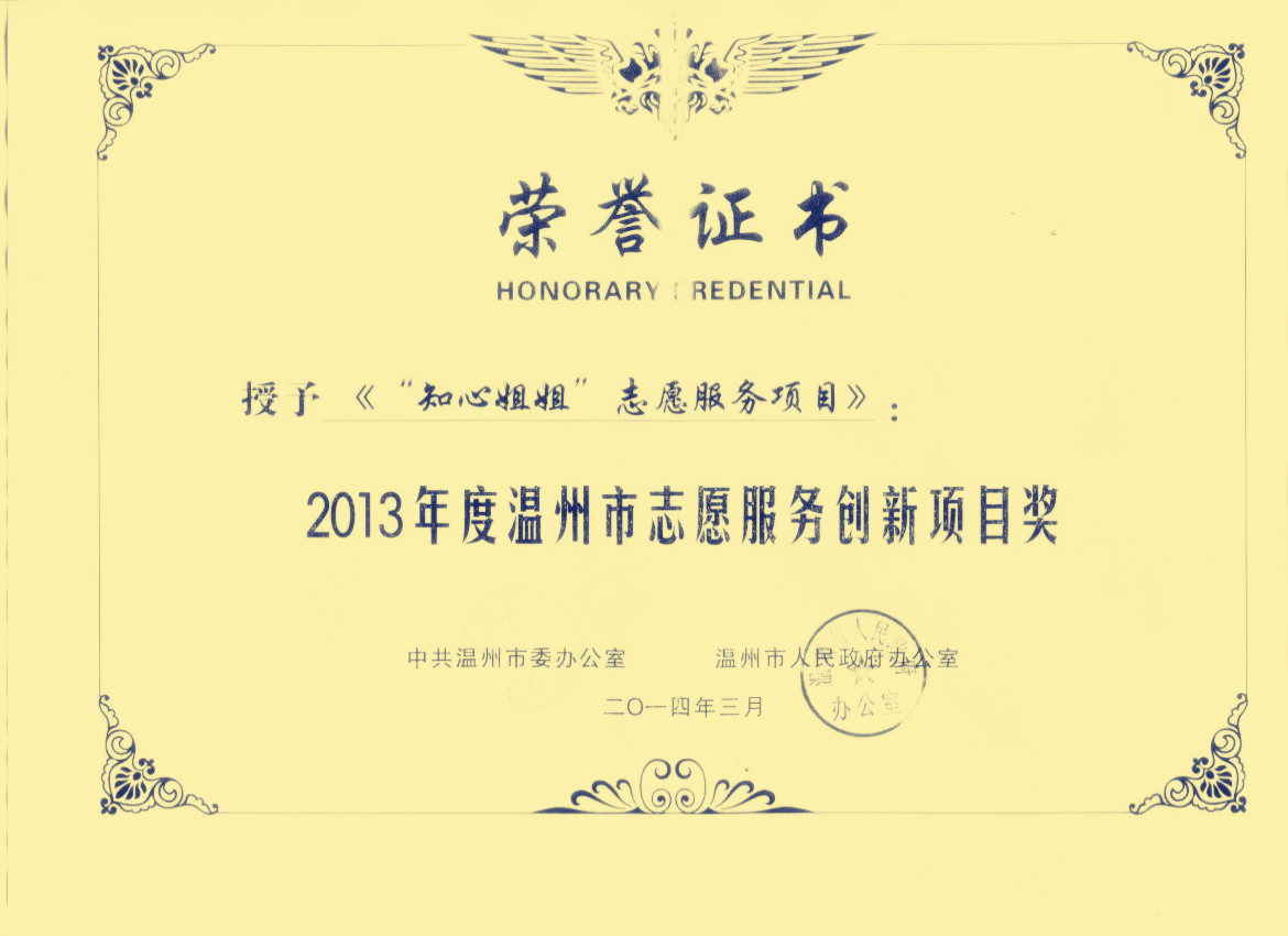 “知心姐姐”荣获2013年团市委春芽计划3A 级项目及2013年温州市志愿服务创新项目奖荣誉两项殊荣。