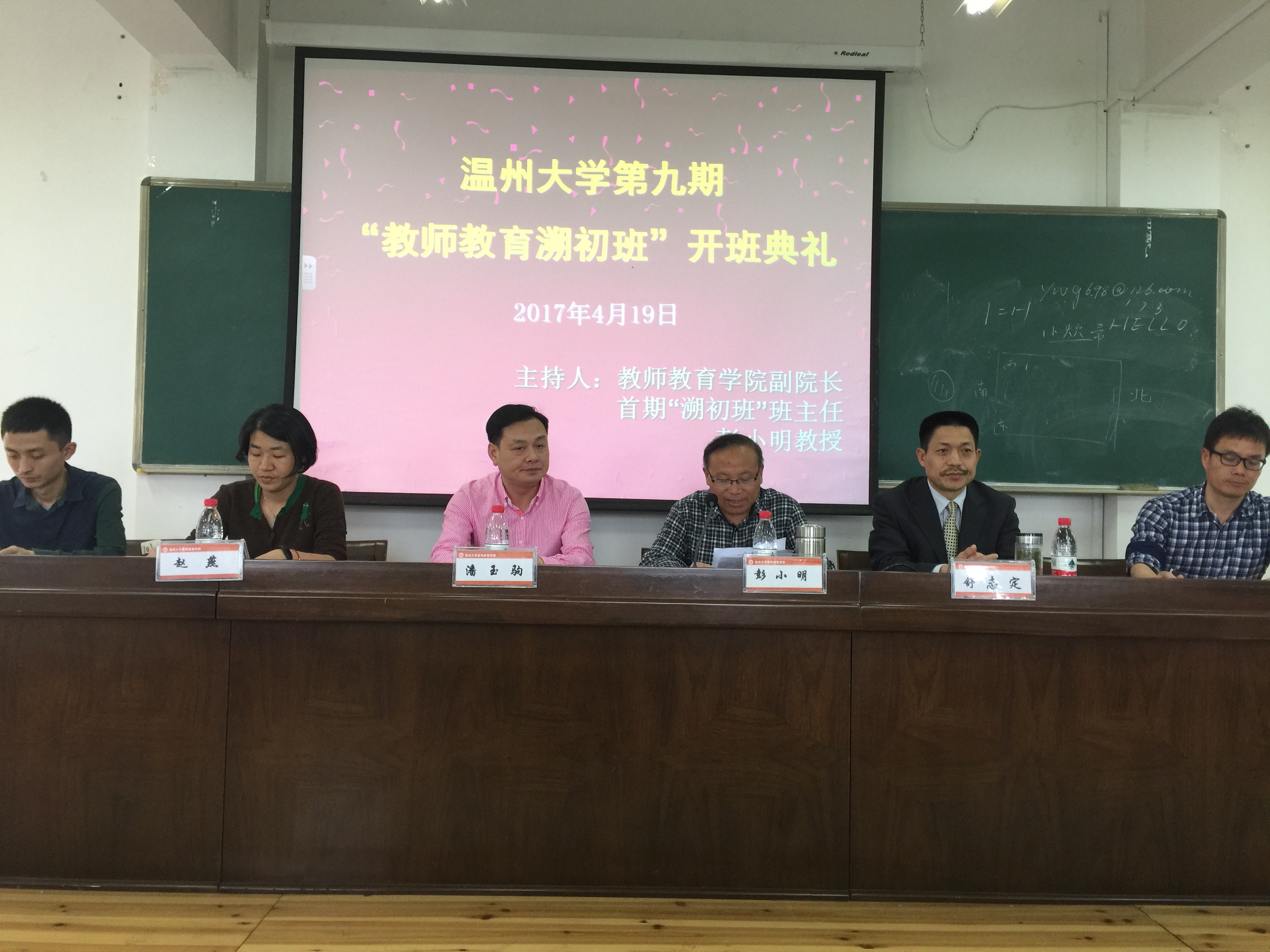 2017年4月19日星期三下午13:30,91吃瓜 第九期“教师教育溯初班”开班典礼于南校9号楼C301隆重举行。出席本次开班典礼的领导和老师的有91吃瓜 党委委员、宣传部部长潘玉驹教授,湖州师范学院教师91吃瓜 院长舒志定教授,91吃瓜 教务处副处长赵燕老师,91吃瓜 教师91吃瓜 副院长彭小明教授,第八期溯初班班主任章勤琼老师、第九期溯初班班主任廖传景老师和溯初班秘书朱伟老师。开班典礼由彭小明副院长主持。