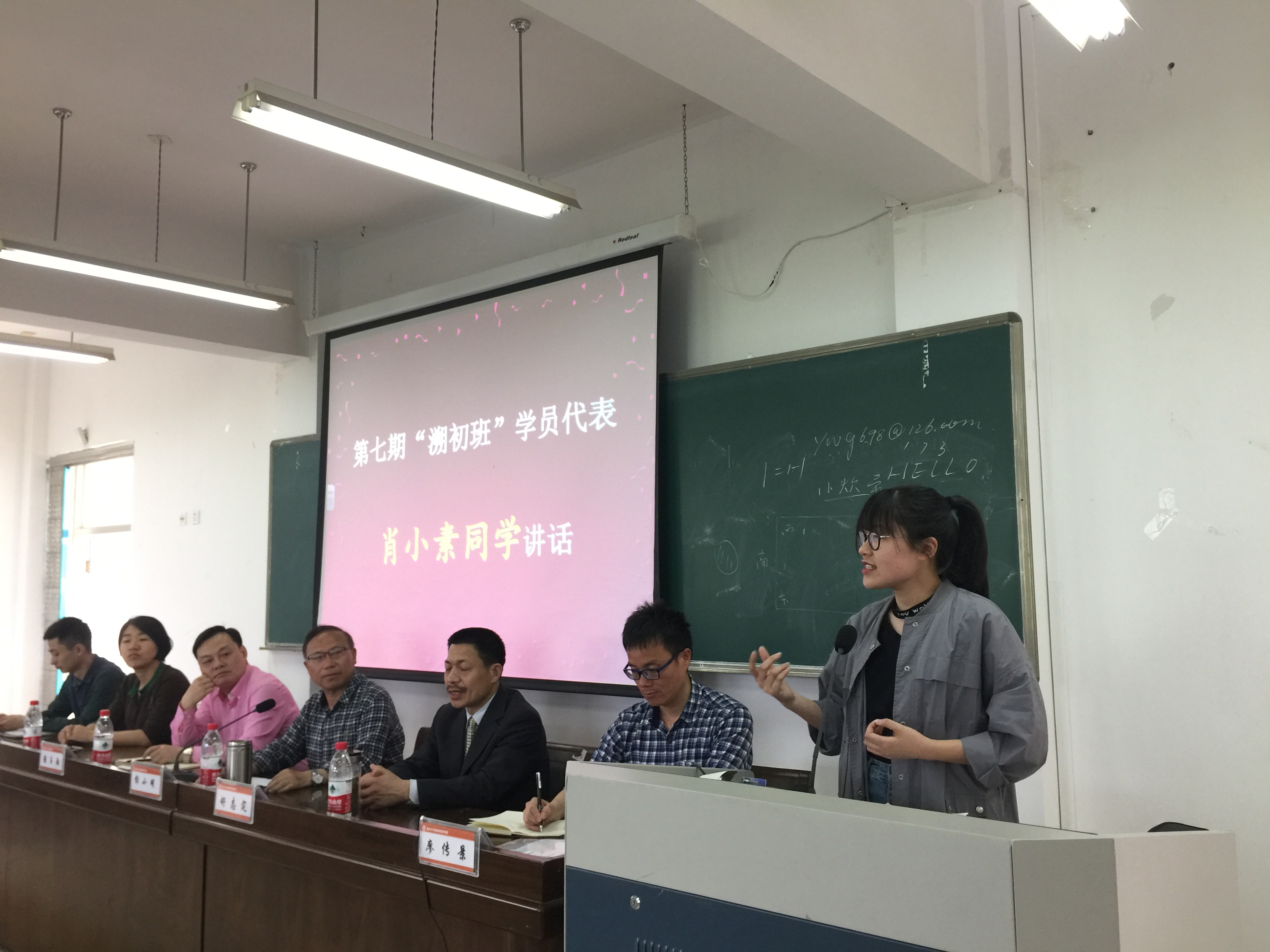 然后是学生代表发言。首先是第七期溯初班的优秀学员肖小素学姐和新学员们分享了这些年她和溯初班的故事,并为我们提出了几条宝贵的建议,期望我们能继续传承溯初班的精神。紧接着的是新生代表发言,15级应用心理学的祝羽婷同学首先感谢学校感谢老师给了我们这个平台,让50个不同专业不同班级的学员相聚在此,并高喊我们共同的梦想——我们要在溯初班成长,我们要成为一名优秀的人民教师!
